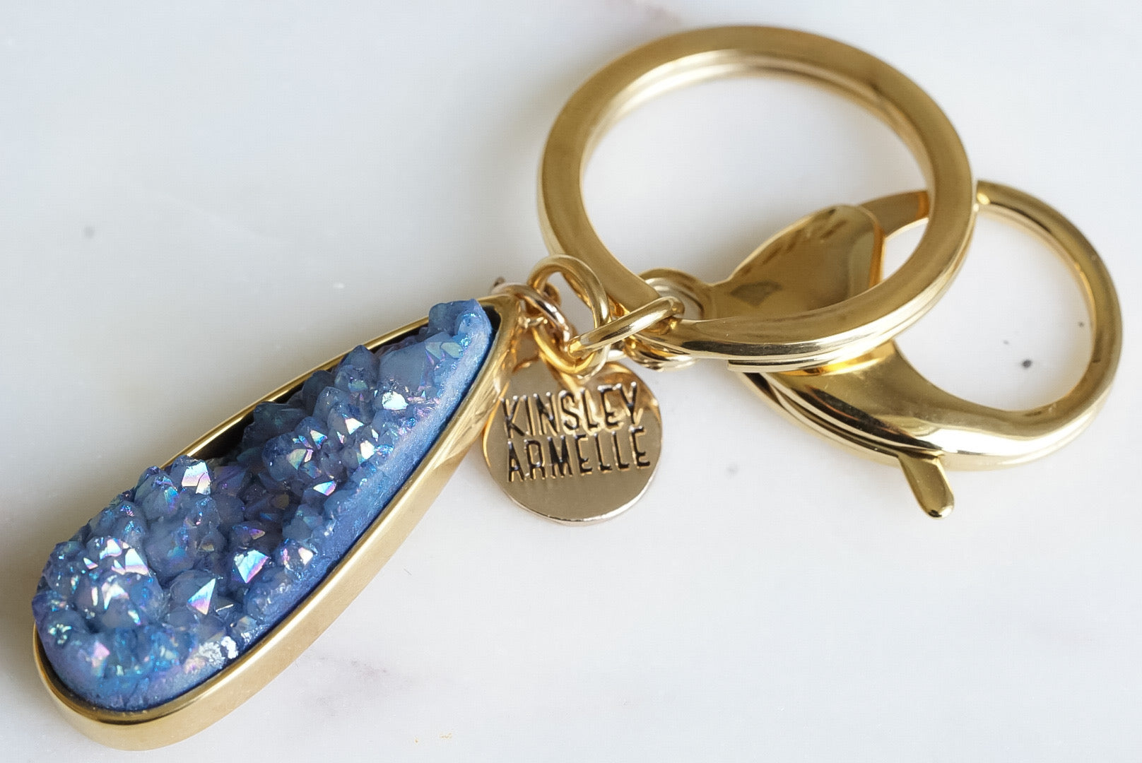 Gold And Blue Sparkling Hypoallergenic Nickel Free Keychain Accessory. Custom Druzy Raw Natural Quartz Stone Accents And Designed With Love In Texas. Size 3.25 Inches Long With Custom Sizing Available On Select Pieces.