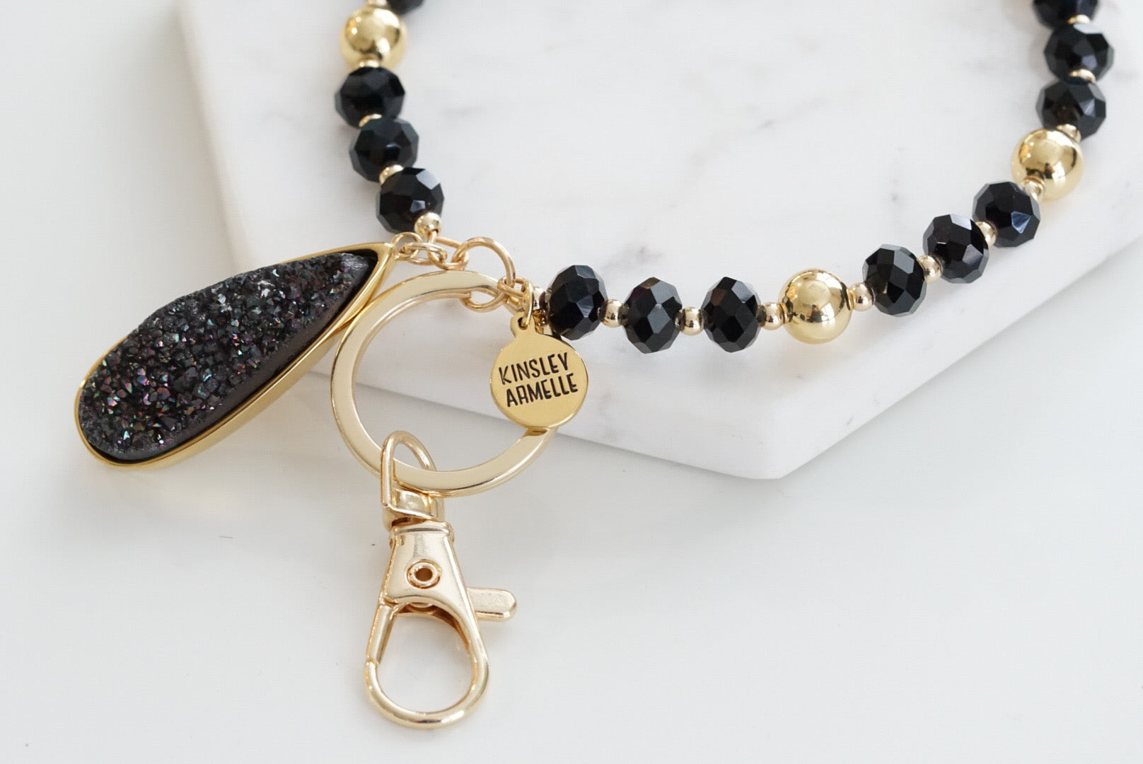 Gold And Black Bangle Black Hypoallergenic Nickel Free Keychain Accessory. Custom Druzy Raw Natural Quartz Stone Accents And Designed With Love In Texas. Size 3 Inch Wide Key Ring With Custom Sizing Available On Select Pieces.