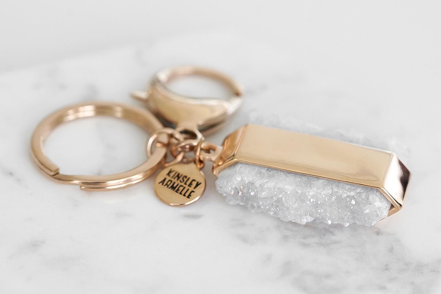 Rose Gold And White Sparkling Hypoallergenic Nickel Free Keychain Accessory. Custom Druzy Raw Natural Quartz Stone Accents And Designed With Love In Texas. Size 3 Inches Long With Custom Sizing Available On Select Pieces.