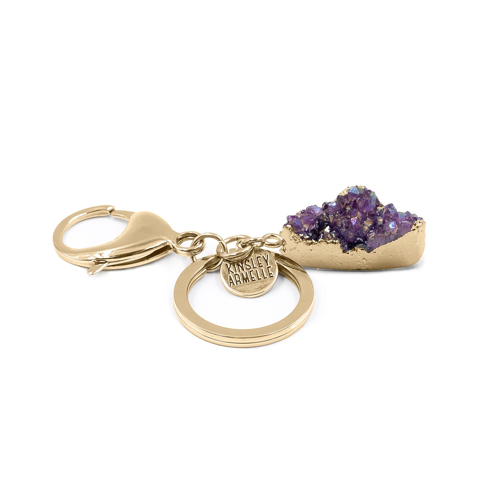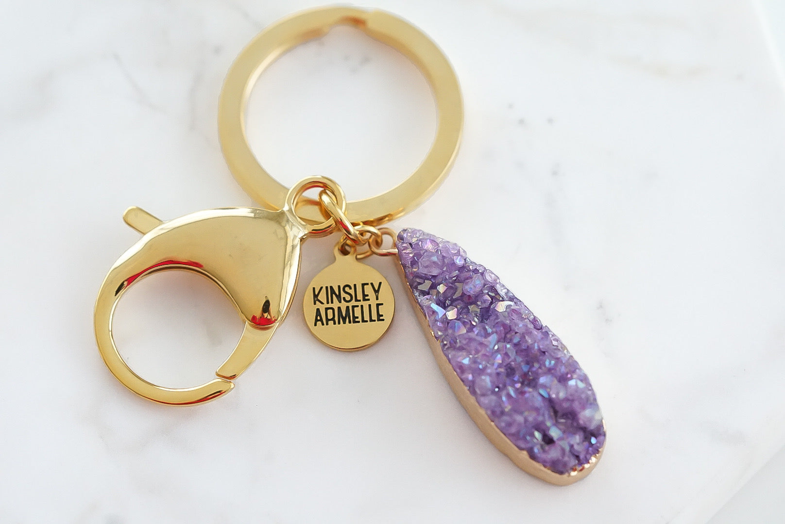 Gold And Purple Sparkling Hypoallergenic Nickel Free Keychain Accessory. Custom Druzy Raw Natural Quartz Stone Accents And Designed With Love In Texas. Size 3.25 Inches Long With Custom Sizing Available On Select Pieces.