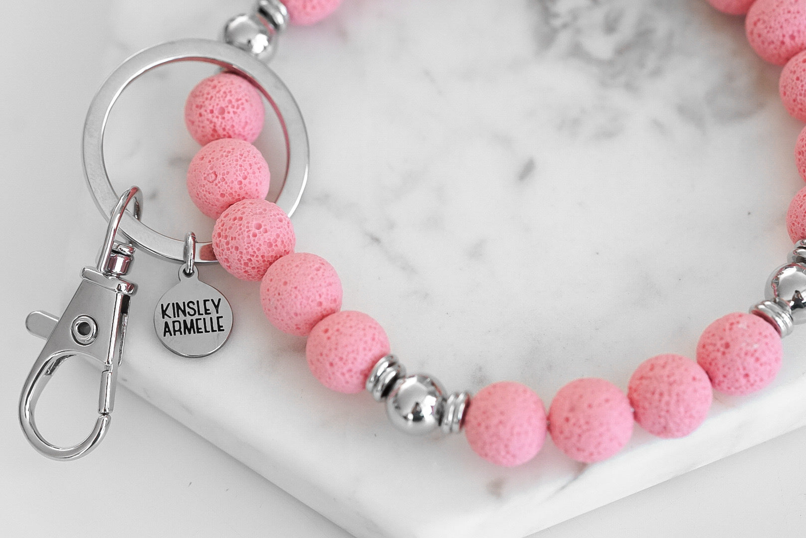Silver And Pink Bangle Hypoallergenic Nickel Free Keychain Accessory. Custom Lava Rock Raw Natural Stone Accents And Designed With Love In Texas. Size 3 Inch Diameter With Custom Sizing Available On Select Pieces.