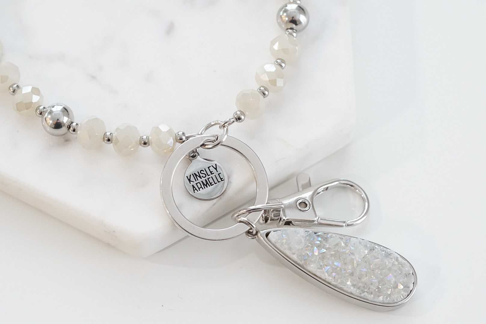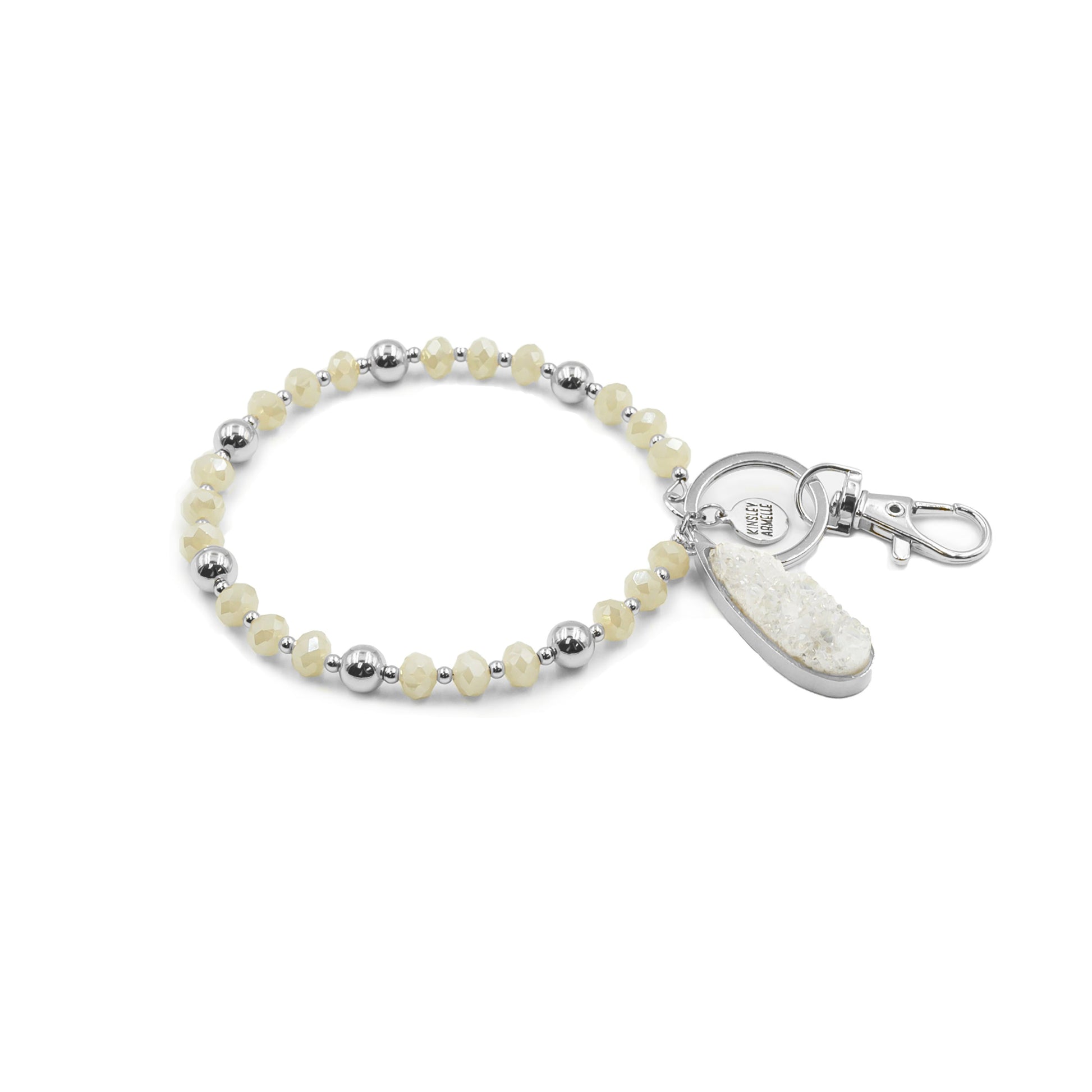 Silver And White Bangle White Hypoallergenic Nickel Free Keychain Accessory. Custom Druzy Raw Natural Quartz Stone Accents And Designed With Love In Texas. Size 3 Inch Wide Key Ring With Custom Sizing Available On Select Pieces.