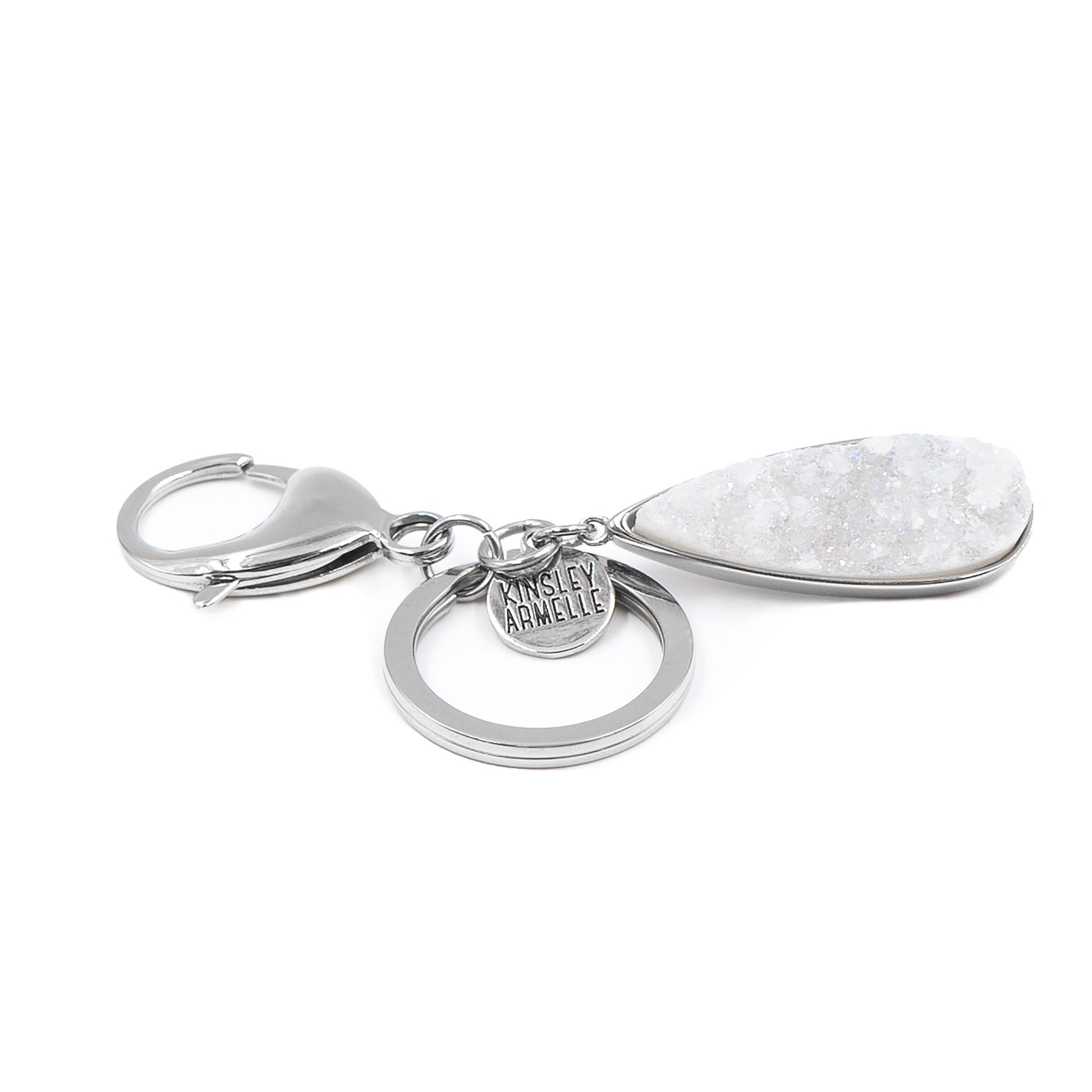 Silver And White Sparkling Hypoallergenic Nickel Free Keychain Accessory. Custom Druzy Raw Natural Quartz Stone Accents And Designed With Love In Texas. Size 3.25 Inches Long With Custom Sizing Available On Select Pieces.