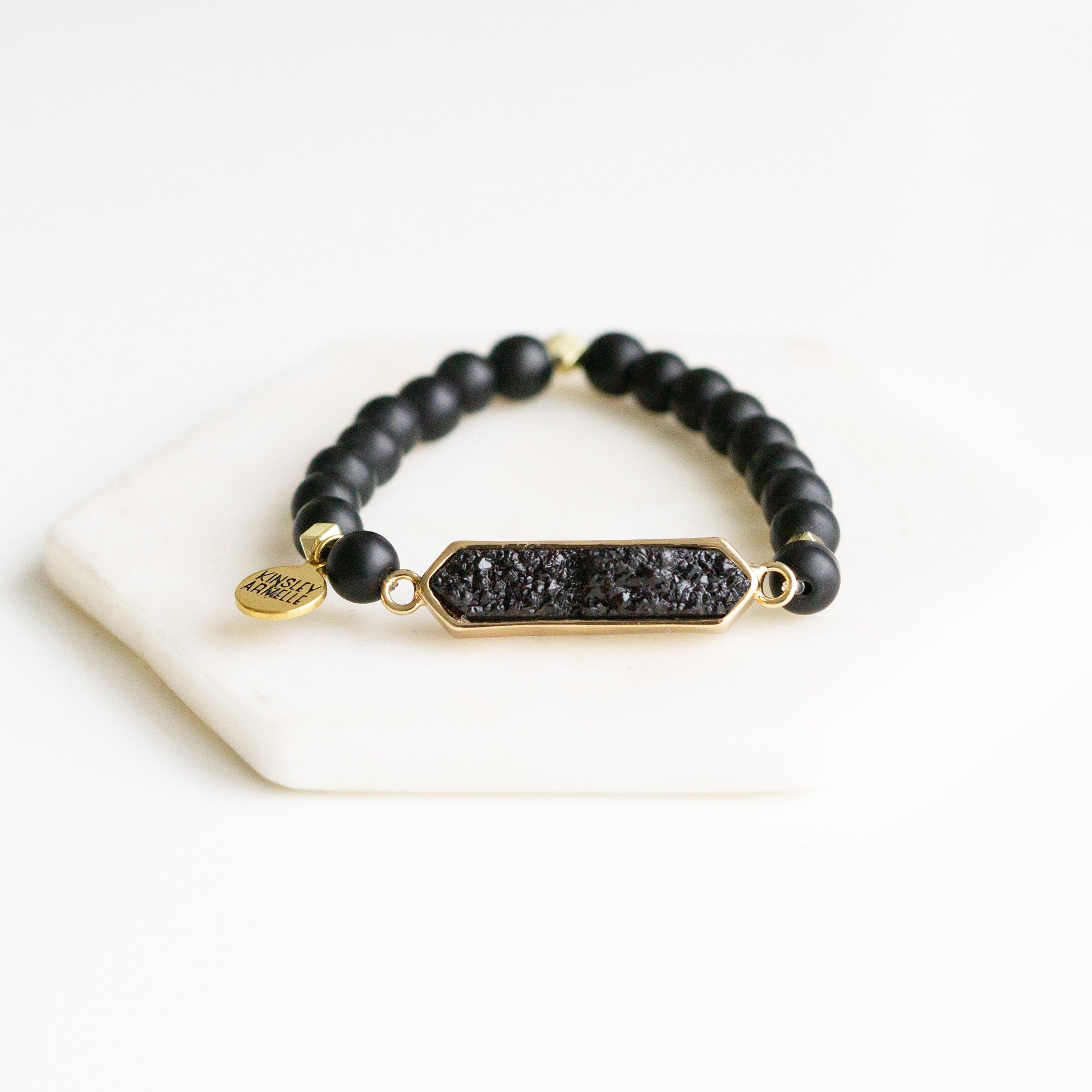 Gold And Black Druzy Faceted Natural Stone Crystal Gemstone Shimmering Sparkling Hypoallergenic Nickel Free Beaded Stretch Bracelet. Custom Druzy Raw Natural Quartz Stone Accents And Designed With Love In Texas. Size Small, Medium, Large, and Extra Large Ranging From 6.25 - 7.25 Inch Circumference With Custom Sizing Available On Select Pieces.