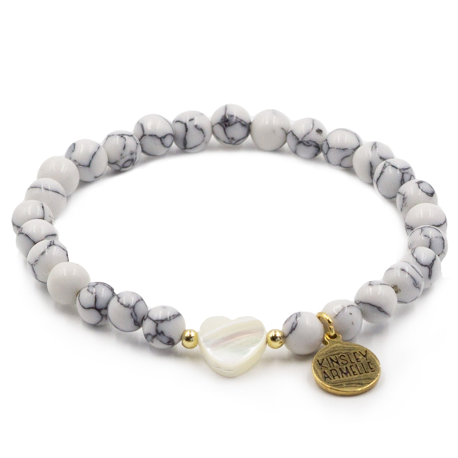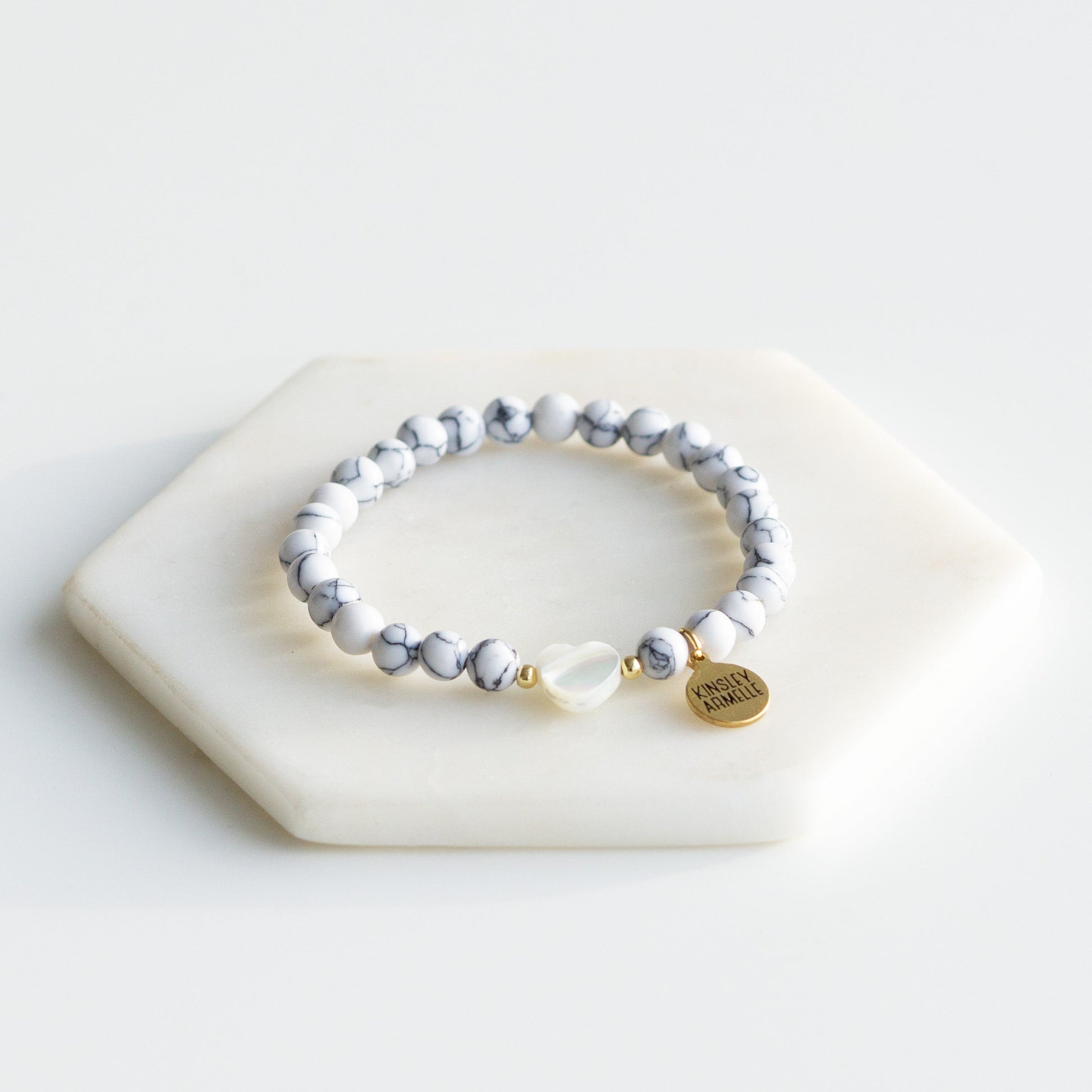 Gold And White Heart Marble Natural Stone Hypoallergenic Nickel Free Beaded Stretch Bracelet. Custom Lucite Acrylic Geometric Shapes Accents And Designed With Love In Texas. Size Small, Medium, Large, and Extra Large Ranging From 6.25 - 7.25 Inch Circumference With Custom Sizing Available On Select Pieces.