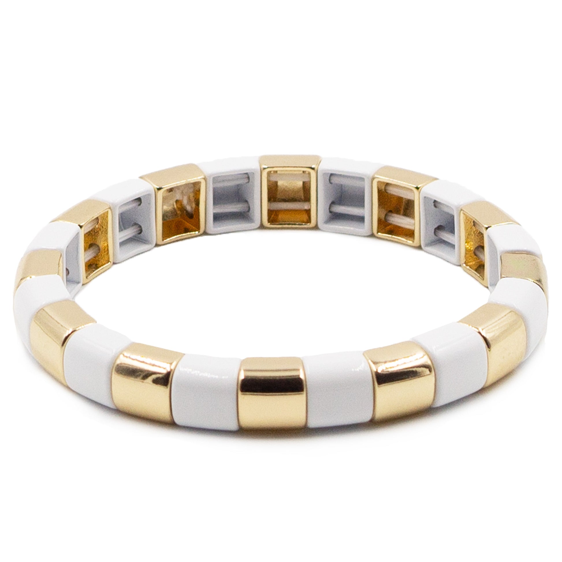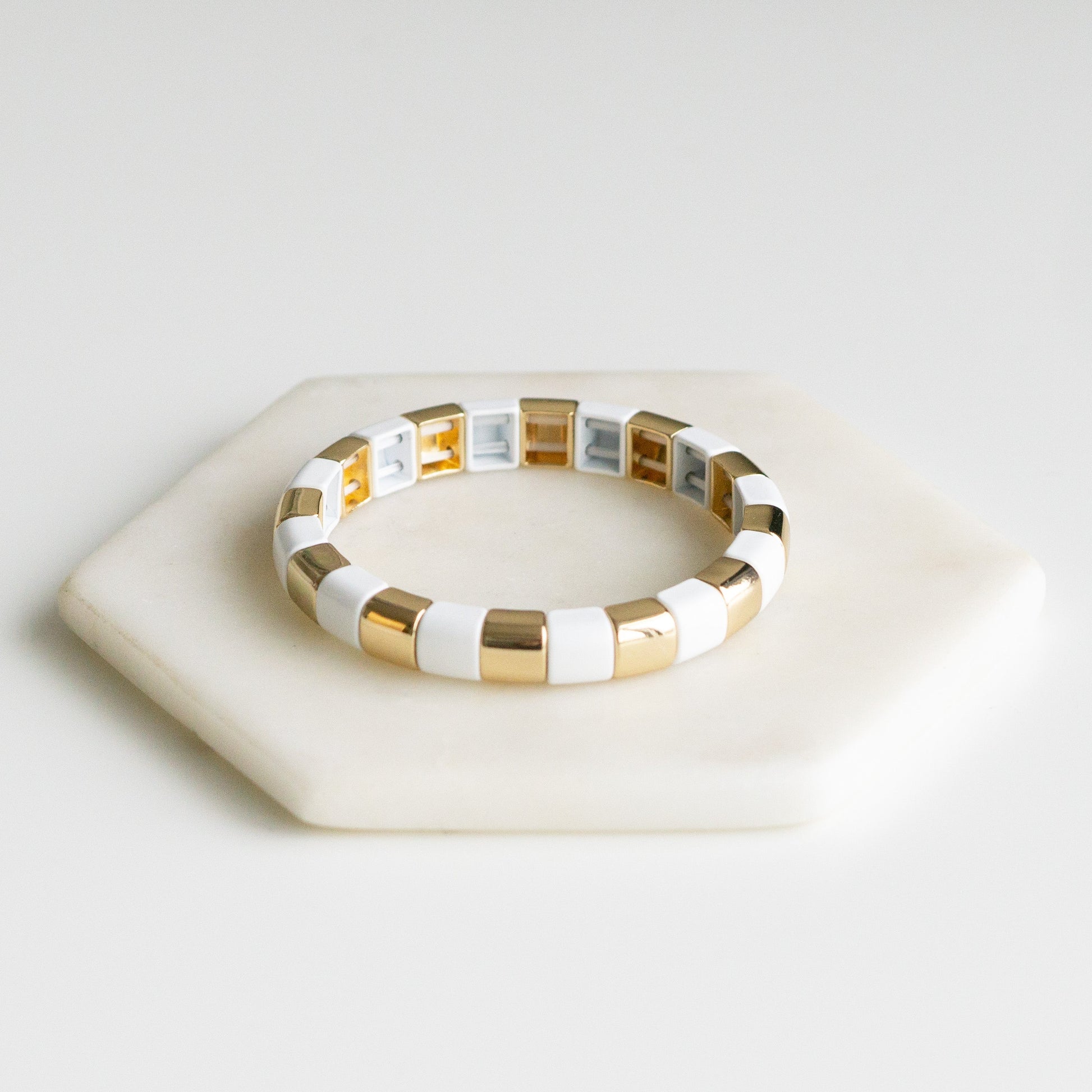 Gold And White Aztec Statement Beaded Stretch Bracelet. Custom Decorative Accent Beads Accents And Designed With Love In Texas. Size Small, Medium, Large, and Extra Large Ranging From 6.25 - 7.25 Inch Circumference With Custom Sizing Available On Select Pieces.