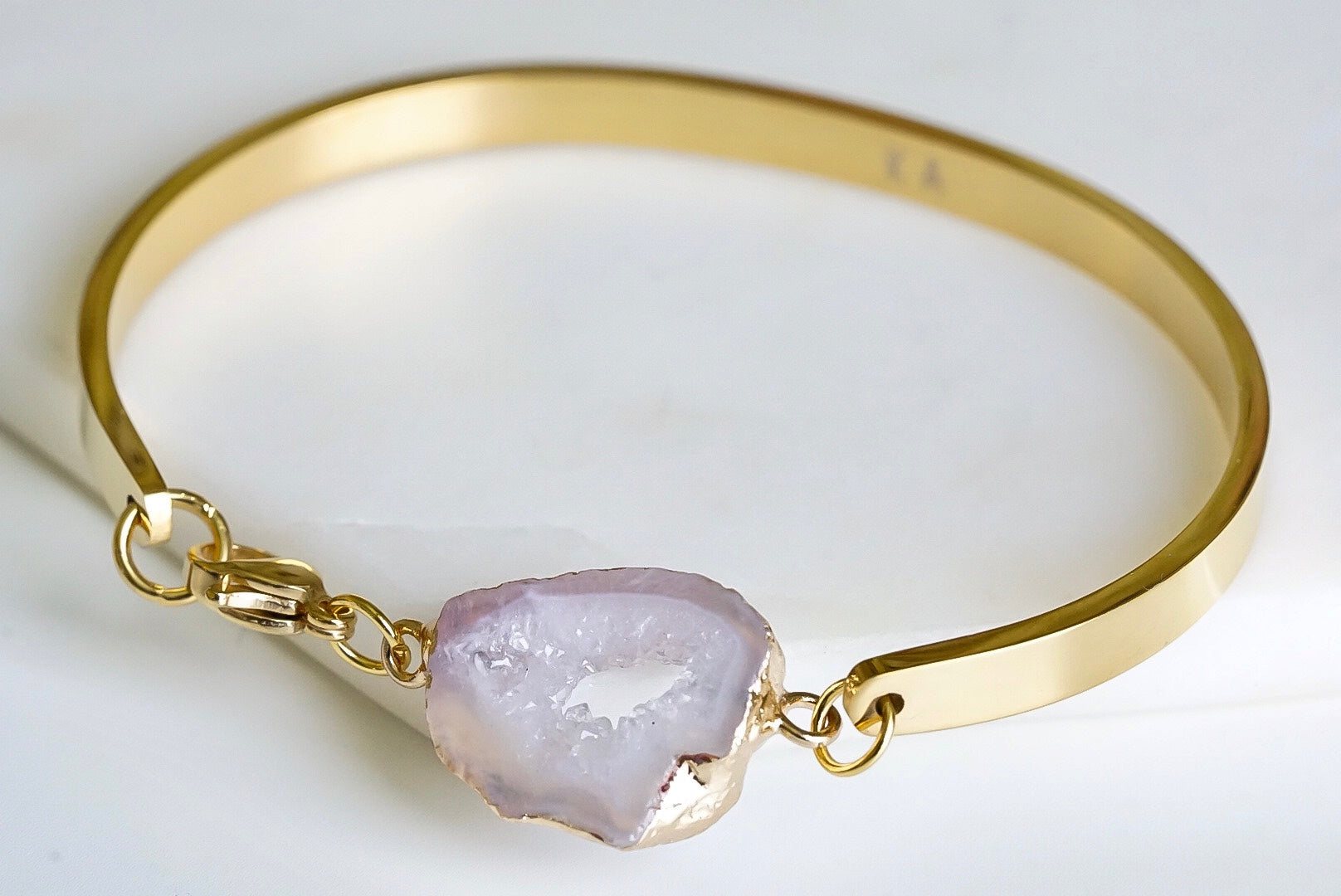 Gold And White Natural Stone Hypoallergenic Nickel Free Bangle Cuff Bracelet. Custom Agate Slices Raw Natural Stone Accents And Designed With Love In Texas. Size Small, Medium, Large, and Extra Large Ranging From 6.25 - 7.25 Inch Circumference With Custom Sizing Available On Select Pieces.