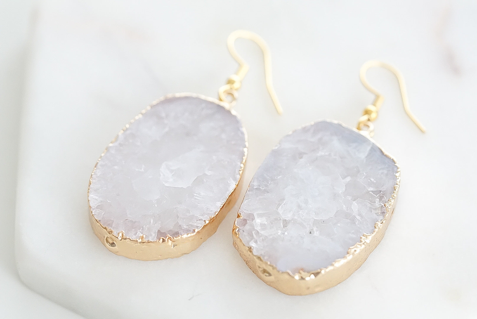 Gold And White Dangle Lightweight Hypoallergenic Nickel Free Drop Earrings. Custom Agate Slices Raw Natural Stone Accents And Designed With Love In Texas. Size 1.5 Inches Length x 1 Inch Width With Custom Sizing Available On Select Pieces.