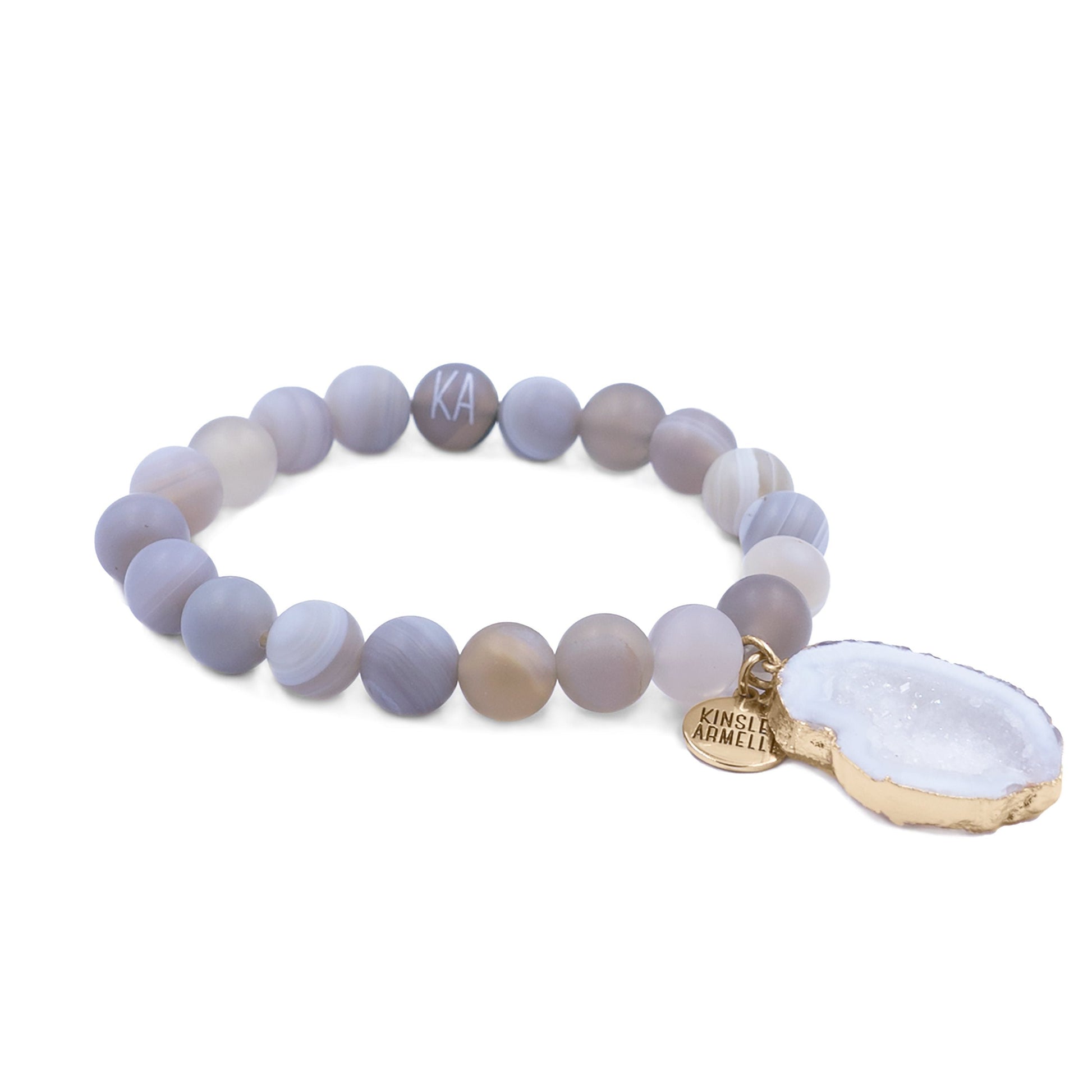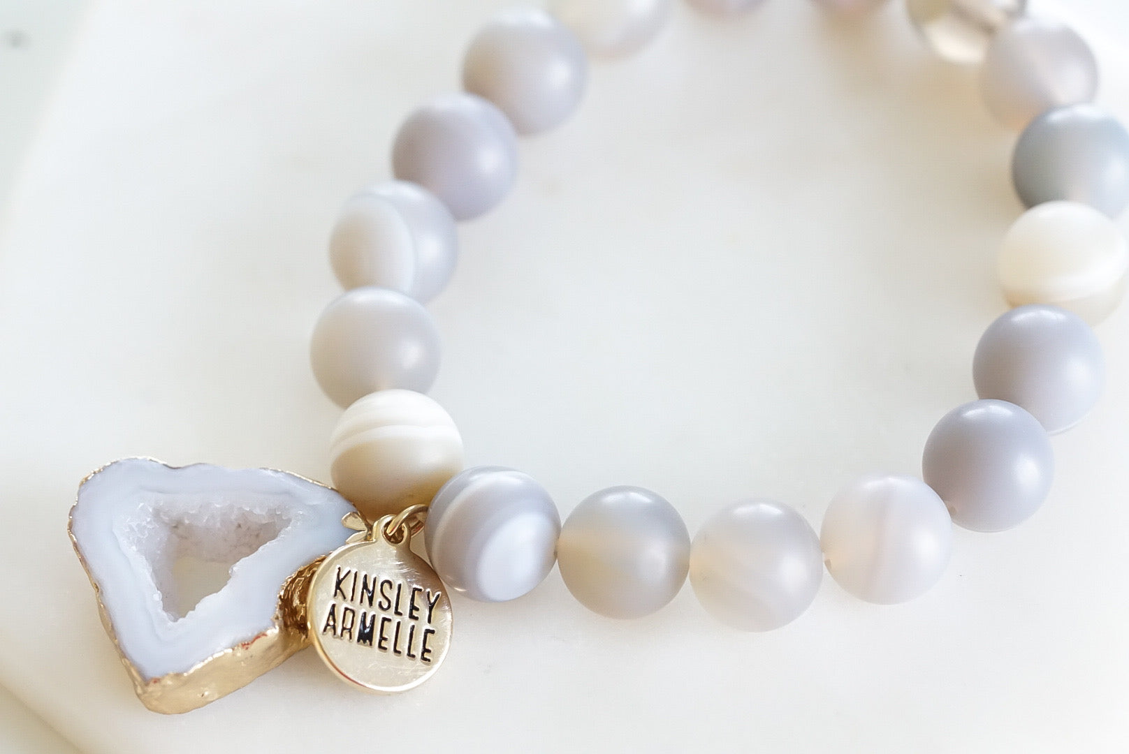 Gold And Gray Charm Dangle Matte Hypoallergenic Nickel Free Beaded Stretch Bracelet. Custom Agate Slices Raw Natural Stone Accents And Designed With Love In Texas. Size Small, Medium, Large, and Extra Large Ranging From 6.25 - 7.25 Inch Circumference With Custom Sizing Available On Select Pieces.