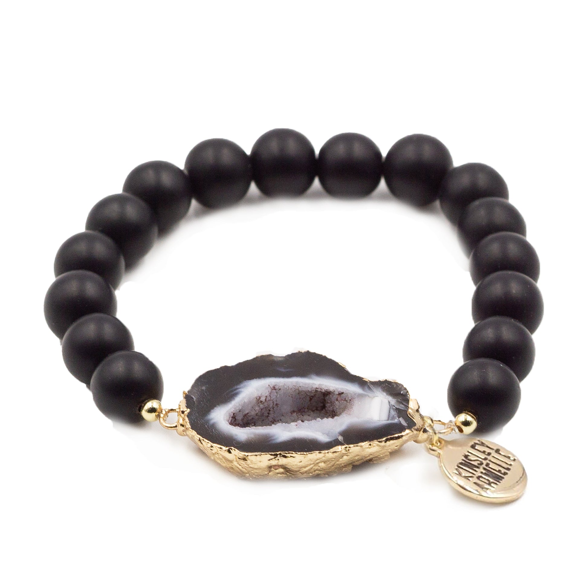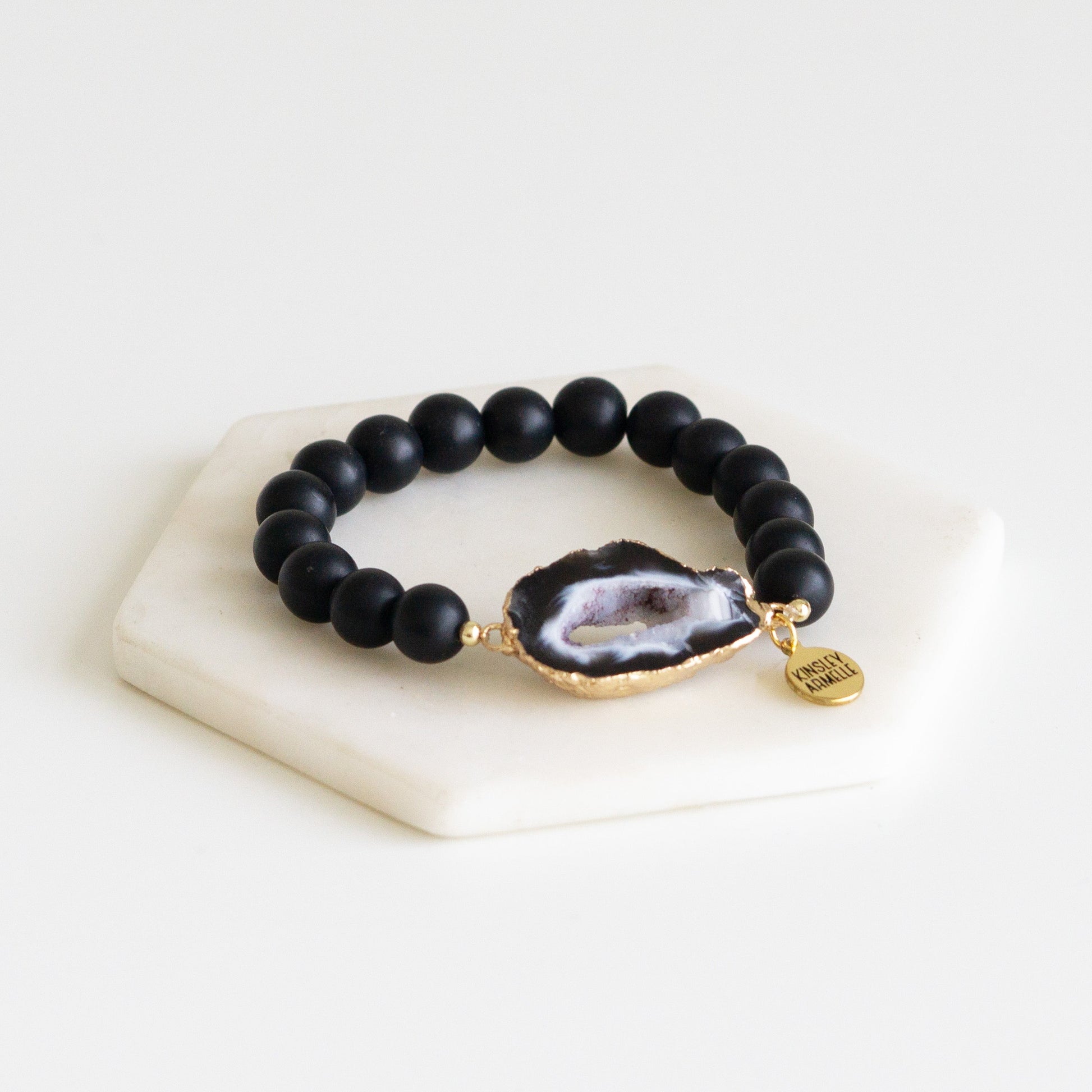 Gold And Black Natural Stone Hypoallergenic Nickel Free Beaded Stretch Bracelet. Custom Agate Slices Raw Natural Stone Accents And Designed With Love In Texas. Size Small, Medium, Large, and Extra Large Ranging From 6.25 - 7.25 Inch Circumference With Custom Sizing Available On Select Pieces.