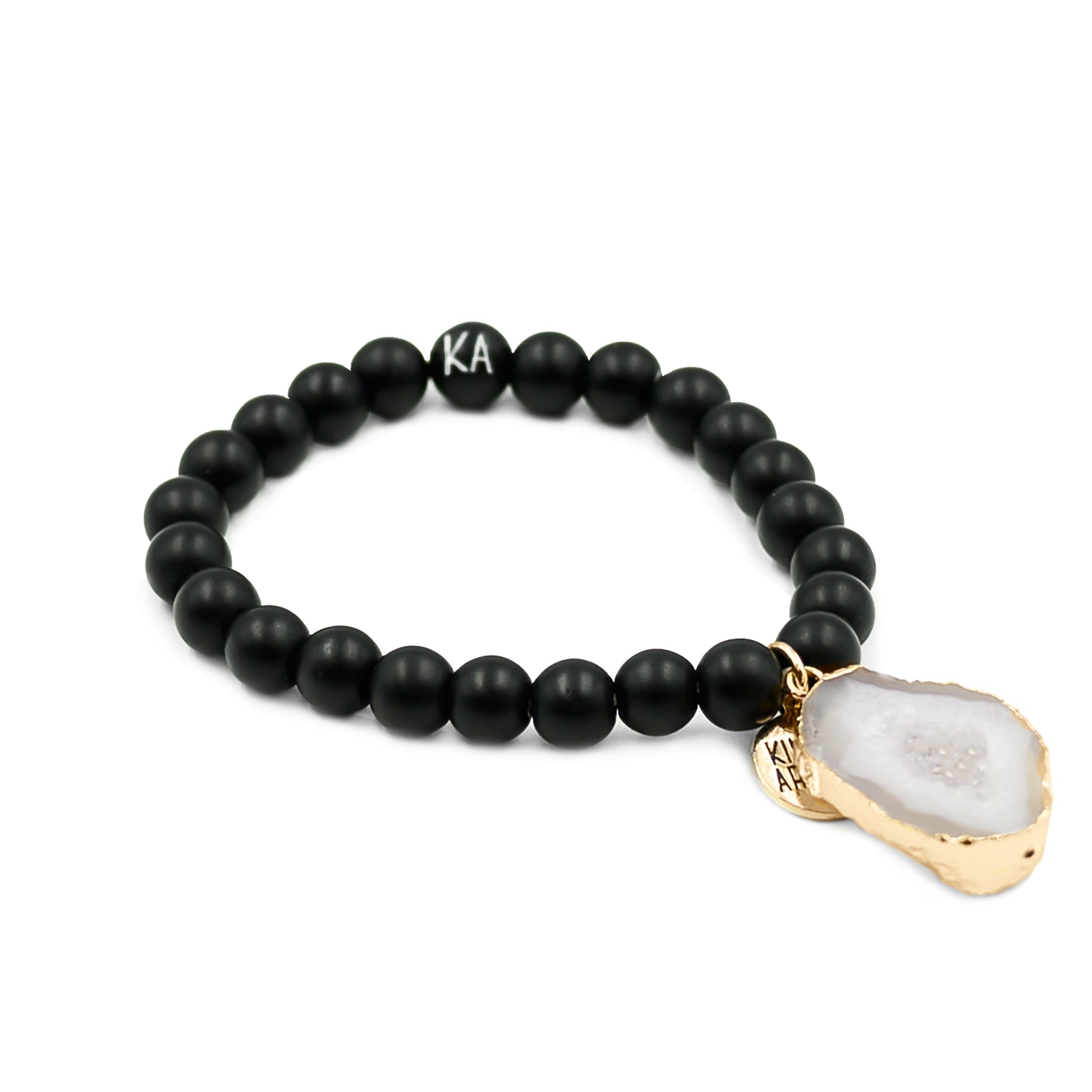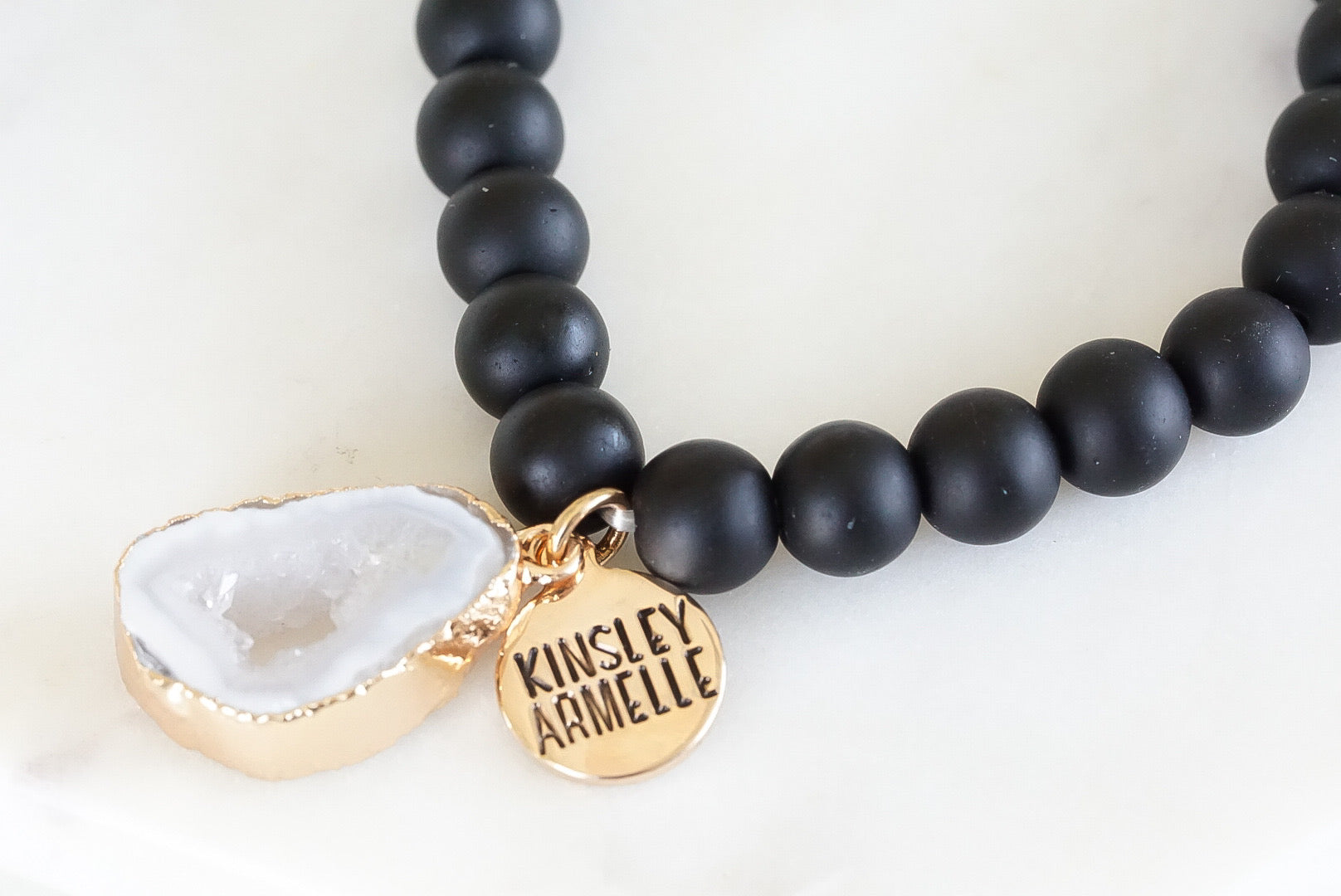 Gold And Black Charm Dangle Matte Hypoallergenic Nickel Free Beaded Stretch Bracelet. Custom Agate Slices Raw Natural Stone Accents And Designed With Love In Texas. Size Small, Medium, Large, and Extra Large Ranging From 6.25 - 7.25 Inch Circumference With Custom Sizing Available On Select Pieces.
