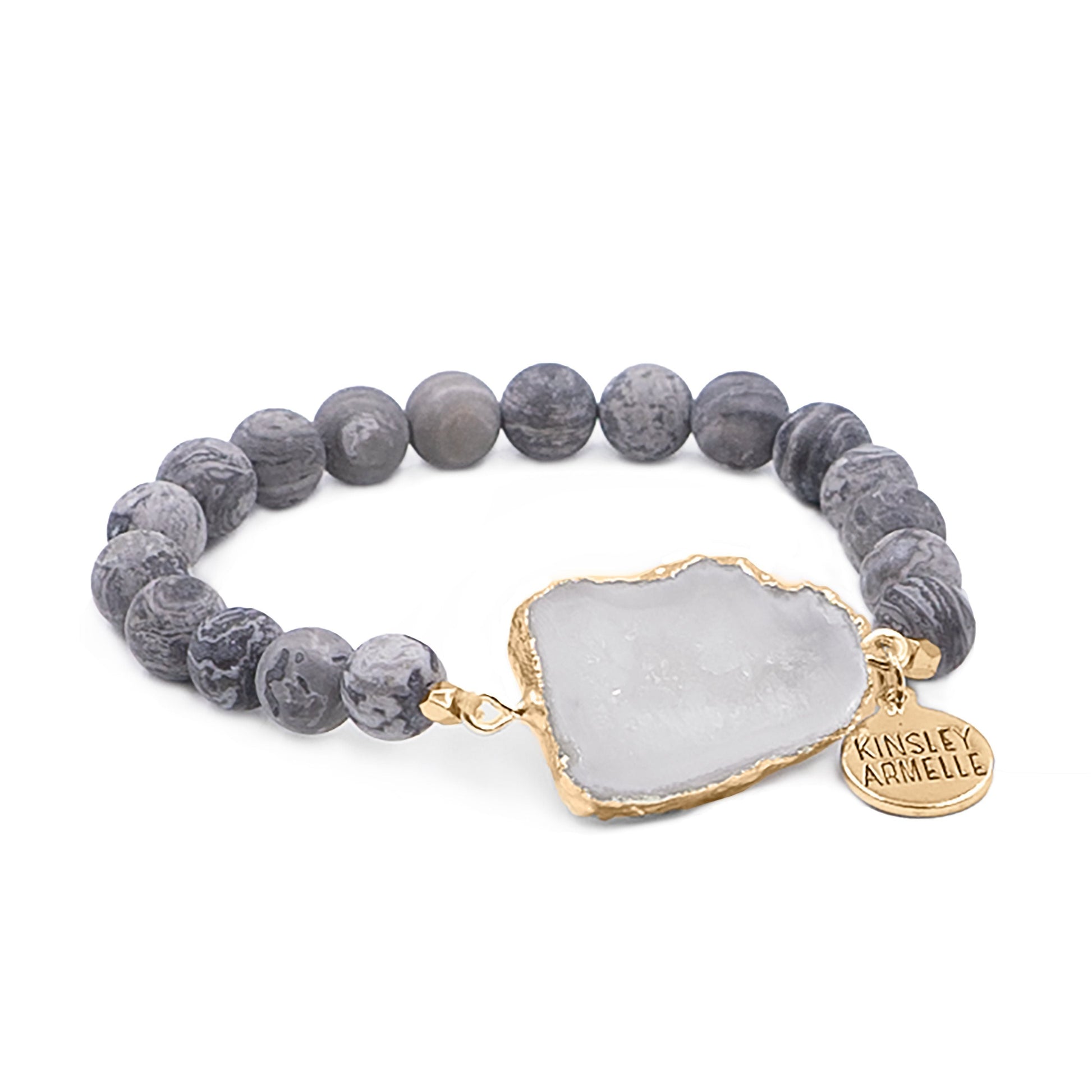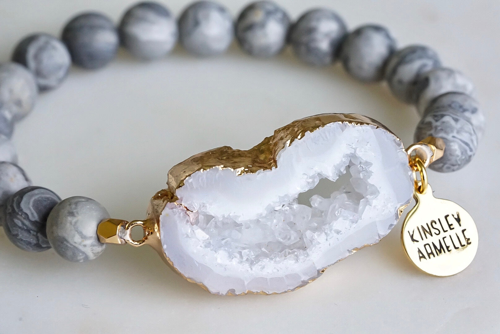 Gold And Gray Marble Natural Stone Hypoallergenic Nickel Free Beaded Stretch Bracelet. Custom Agate Slices Raw Natural Stone Accents And Designed With Love In Texas. Size Small, Medium, Large, and Extra Large Ranging From 6.25 - 7.25 Inch Circumference With Custom Sizing Available On Select Pieces.