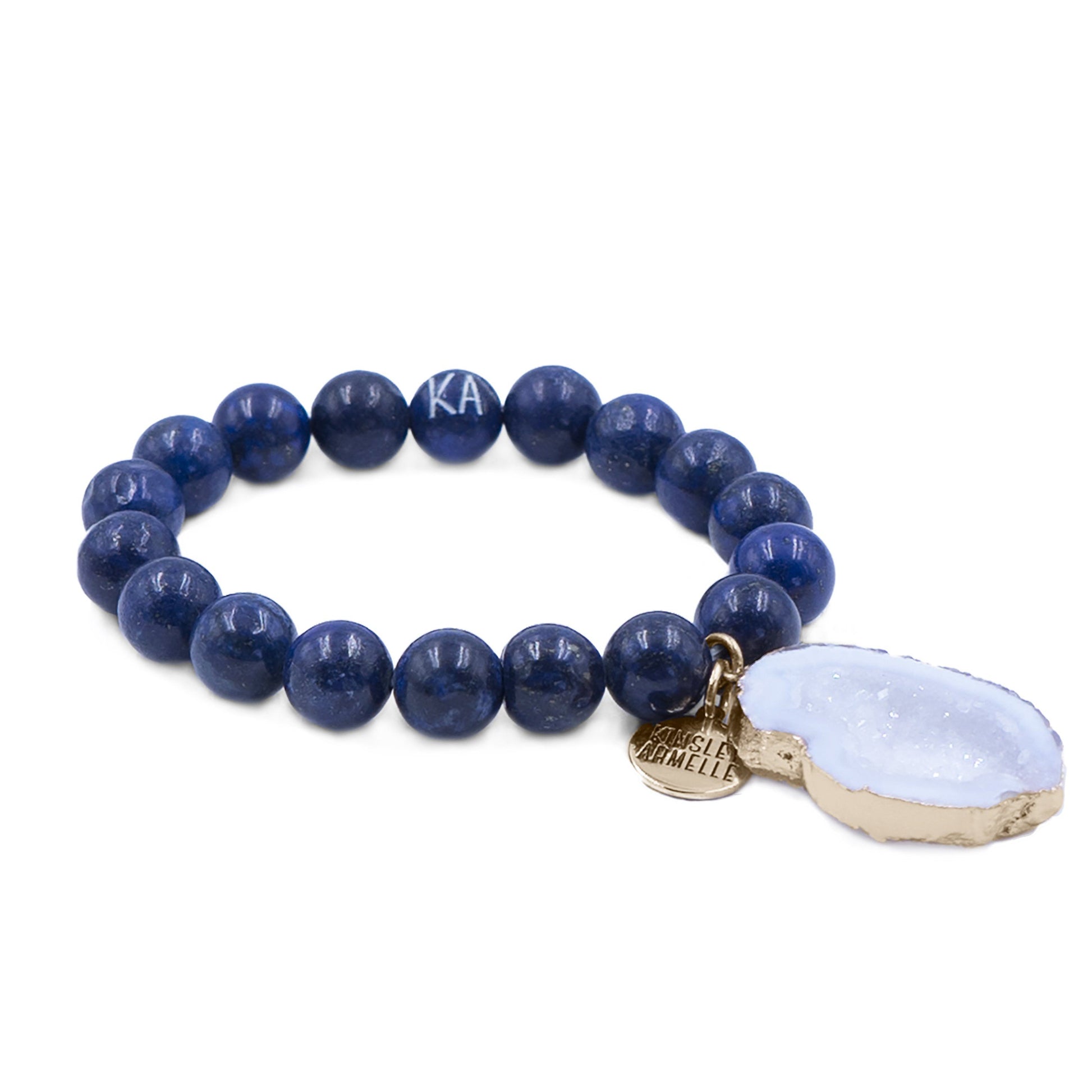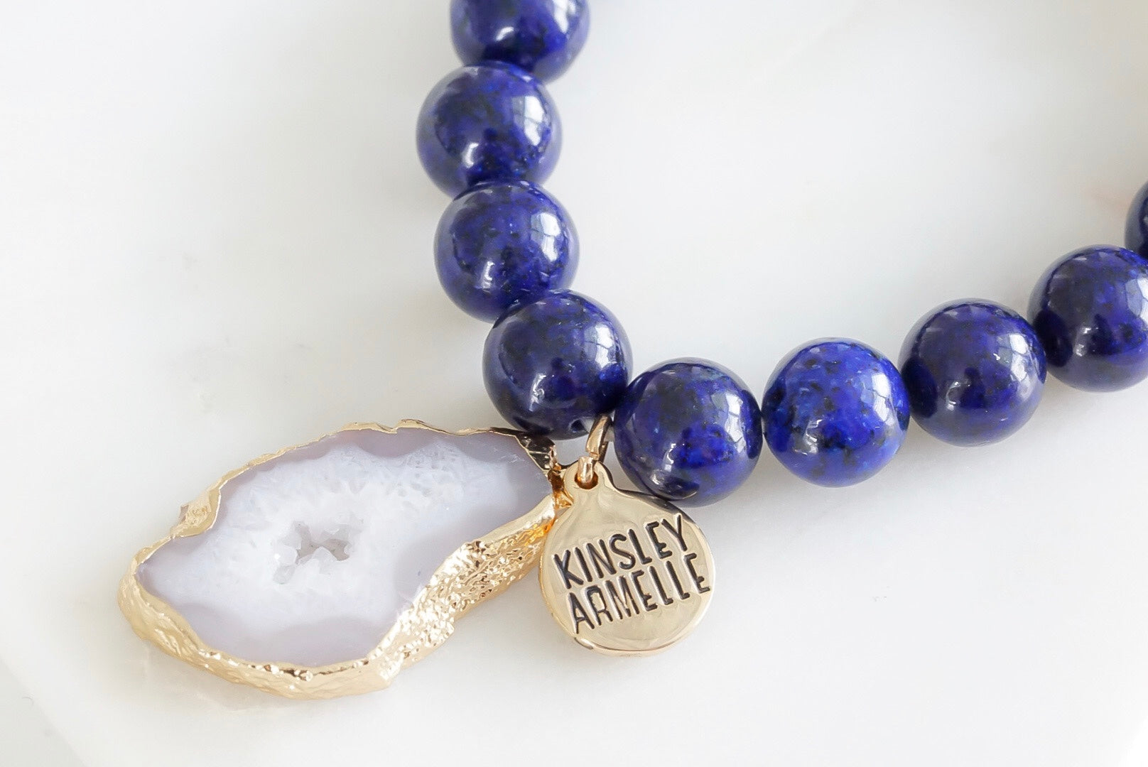 Gold And Blue Charm Dangle Glossy Hypoallergenic Nickel Free Beaded Stretch Bracelet. Custom Agate Slices Raw Natural Stone Accents And Designed With Love In Texas. Size Small, Medium, Large, and Extra Large Ranging From 6.25 - 7.25 Inch Circumference With Custom Sizing Available On Select Pieces.