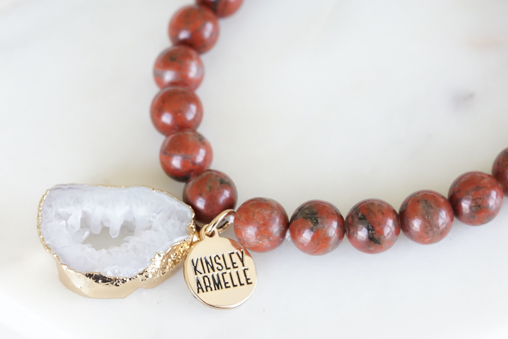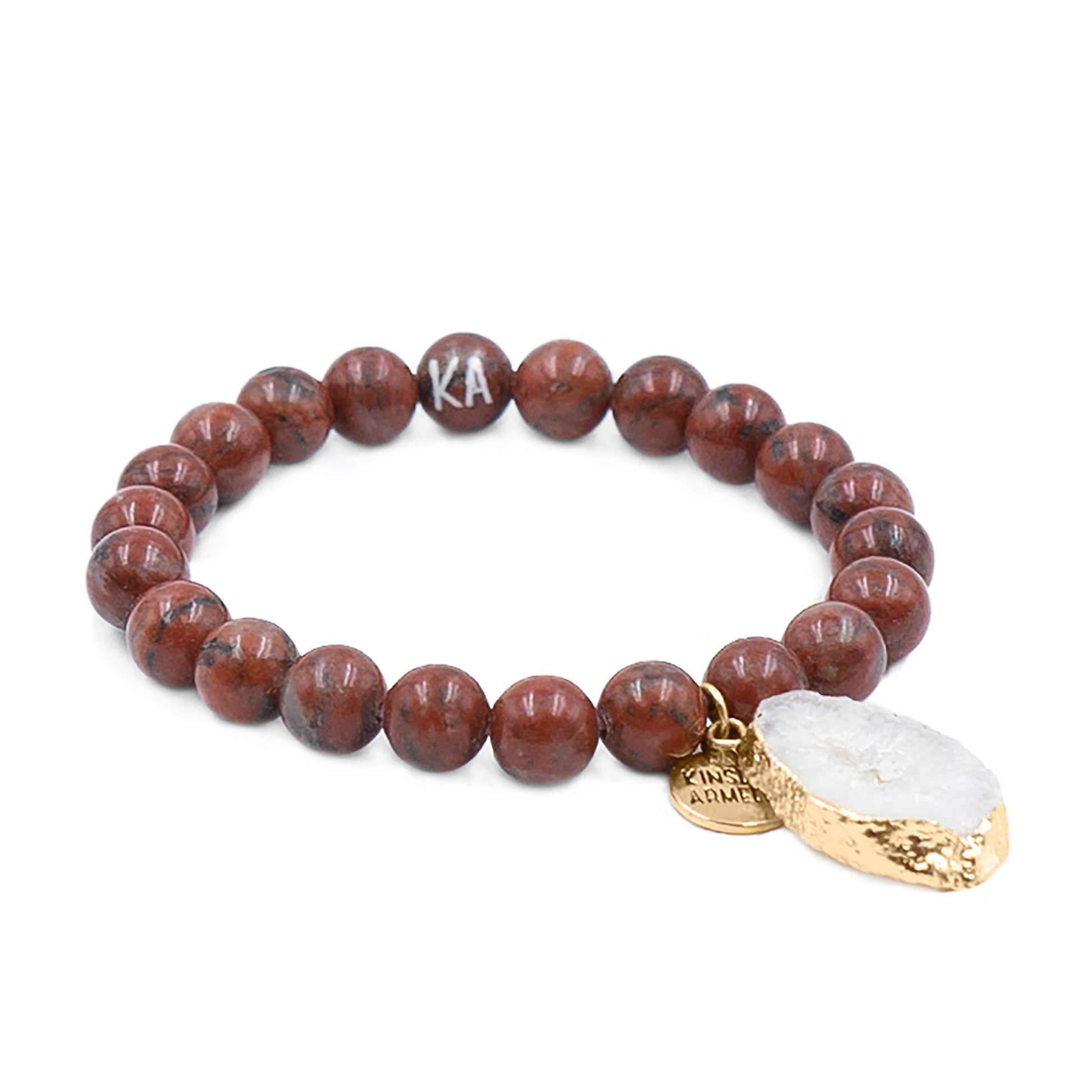 Gold And Red Charm Dangle Glossy Hypoallergenic Nickel Free Beaded Stretch Bracelet. Custom Agate Slices Raw Natural Stone Accents And Designed With Love In Texas. Size Small, Medium, Large, and Extra Large Ranging From 6.25 - 7.25 Inch Circumference With Custom Sizing Available On Select Pieces.