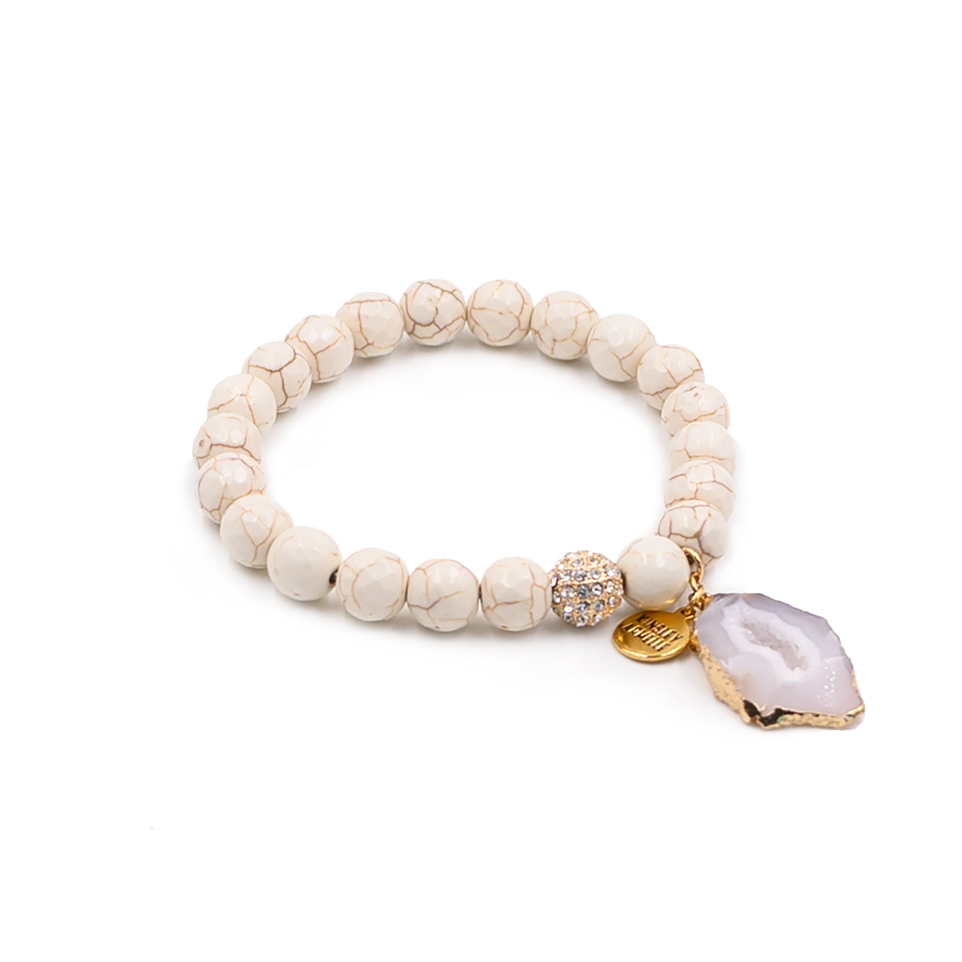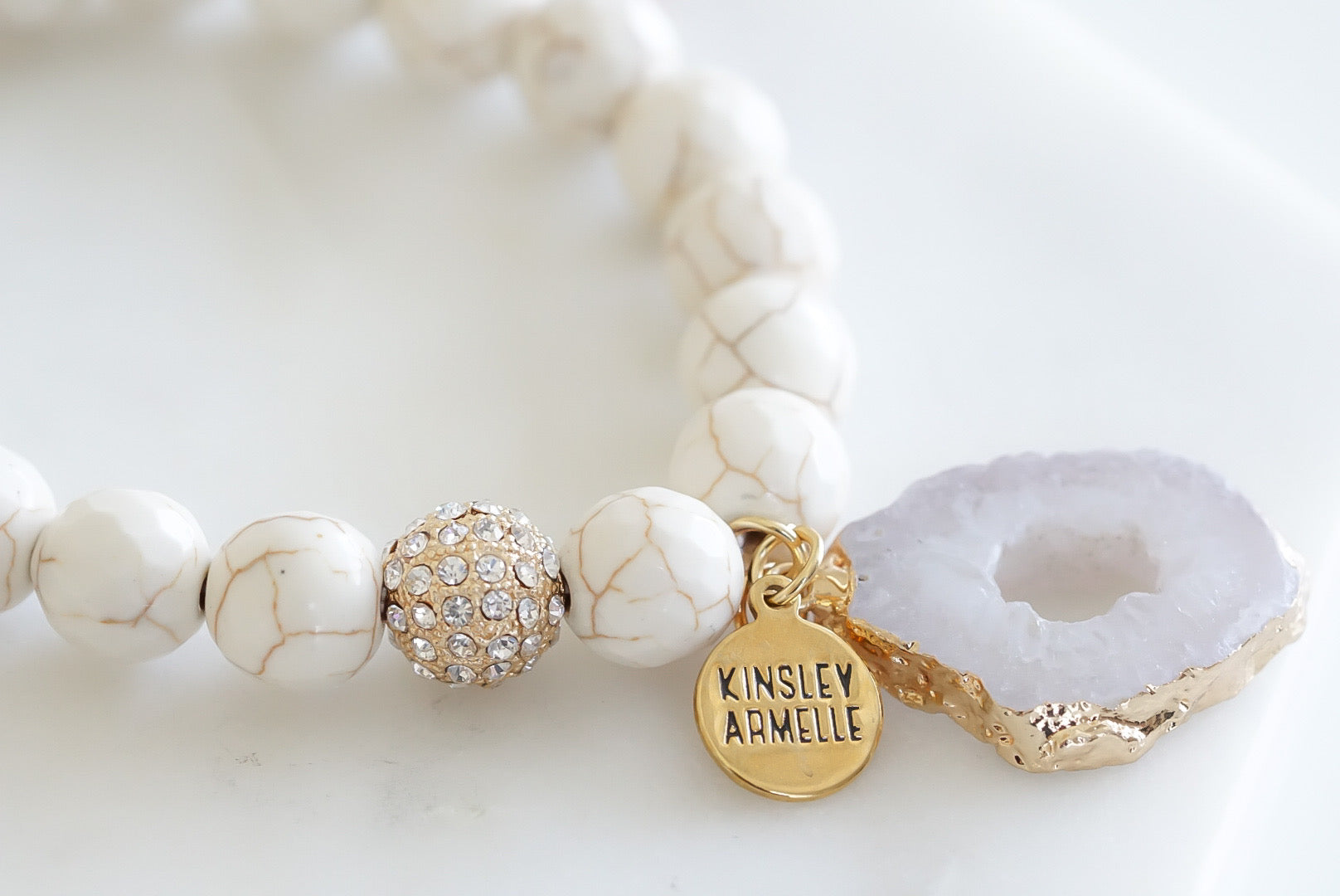Gold And Brown Charm Dangle Glossy Hypoallergenic Nickel Free Beaded Stretch Bracelet. Custom Agate Slices Raw Natural Stone Accents And Designed With Love In Texas. Size Small, Medium, Large, and Extra Large Ranging From 6.25 - 7.25 Inch Circumference With Custom Sizing Available On Select Pieces.
