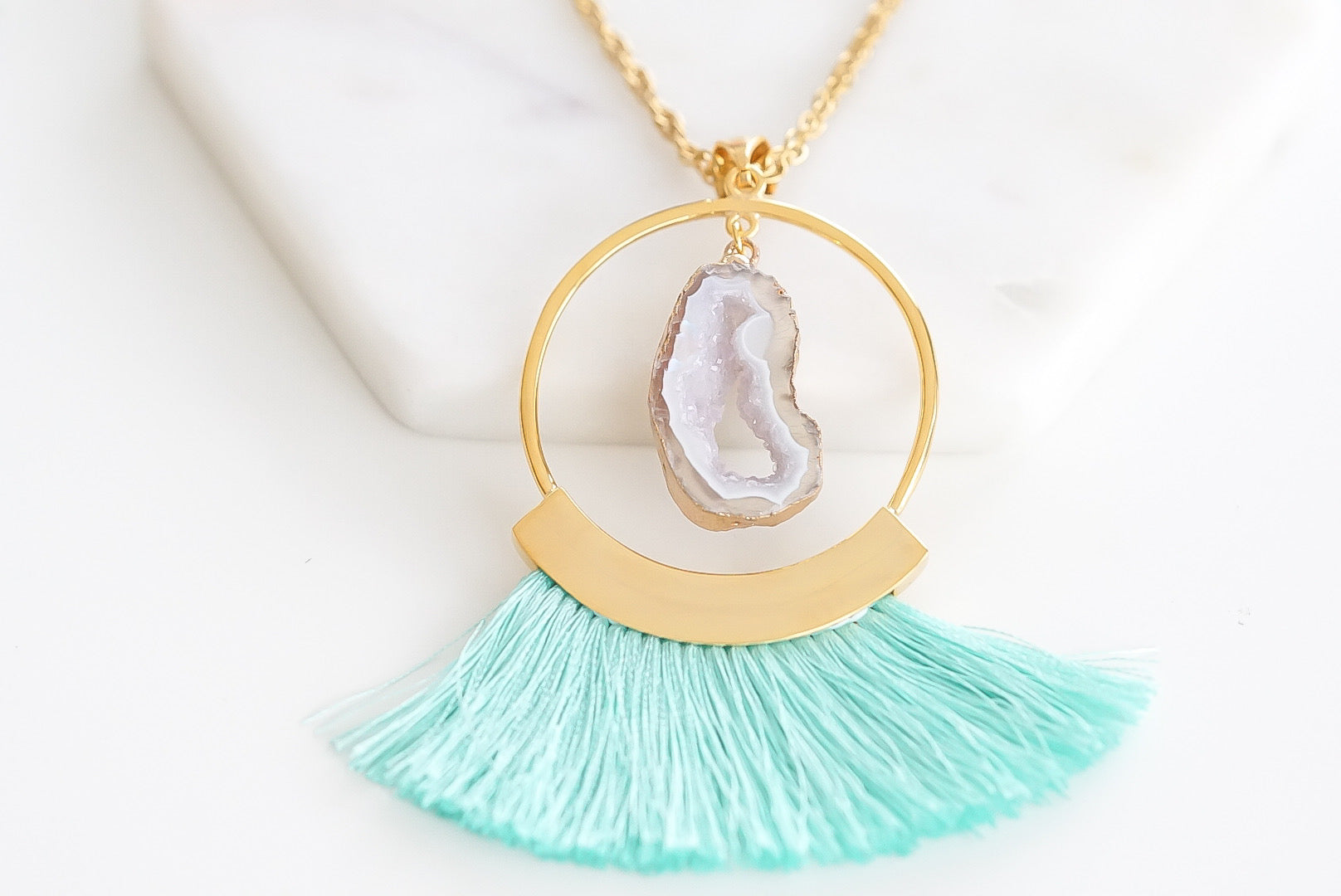 Gold And Light Blue Dangle Fringe Tassel Hypoallergenic Nickel Free Statement Pendant Necklace. Custom Agate Slices Raw Natural Stone Accents And Designed With Love In Texas. Size 32 Inch Length, Plus 3 Inch Attached Necklace Extender With Custom Sizing Available On Select Pieces.