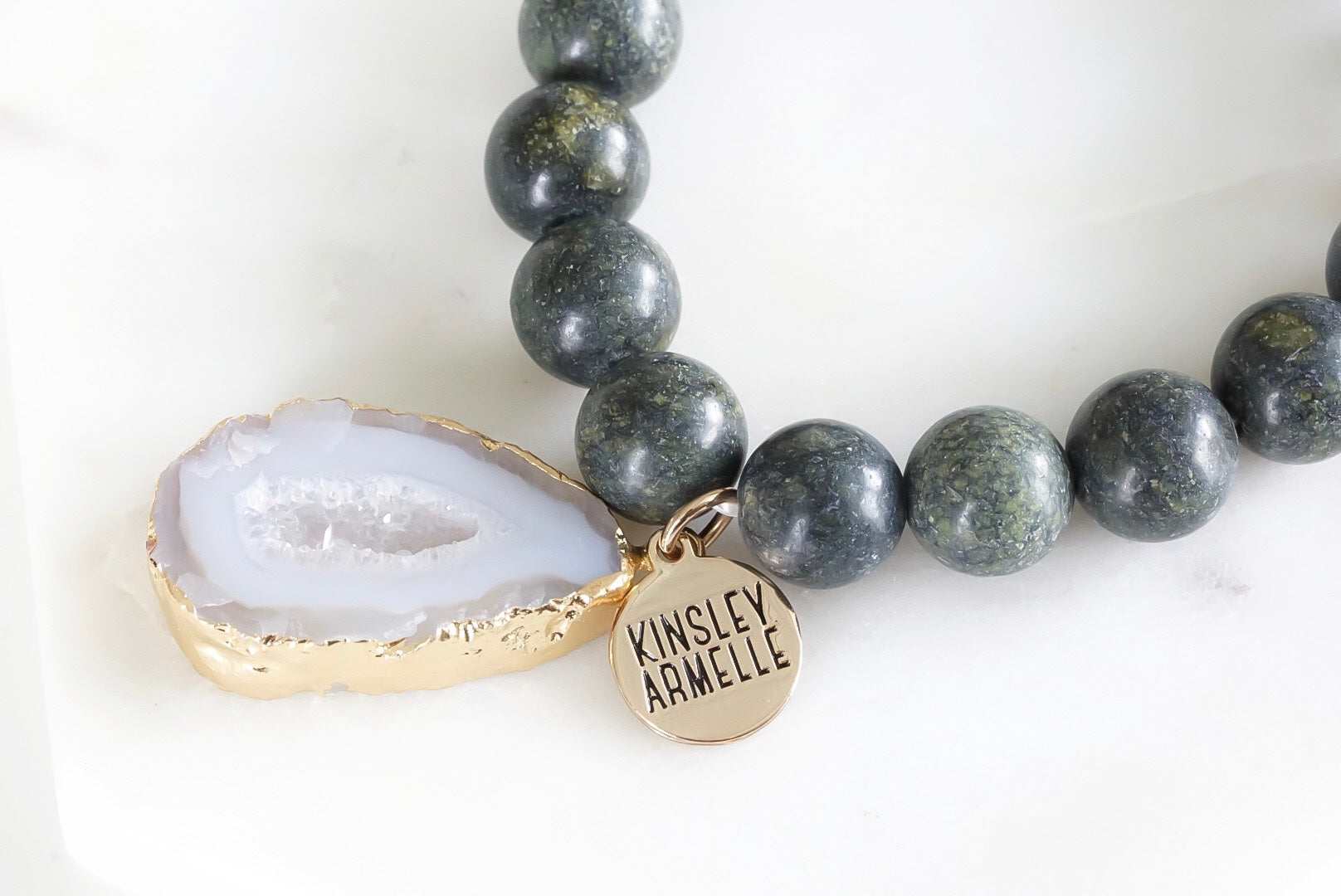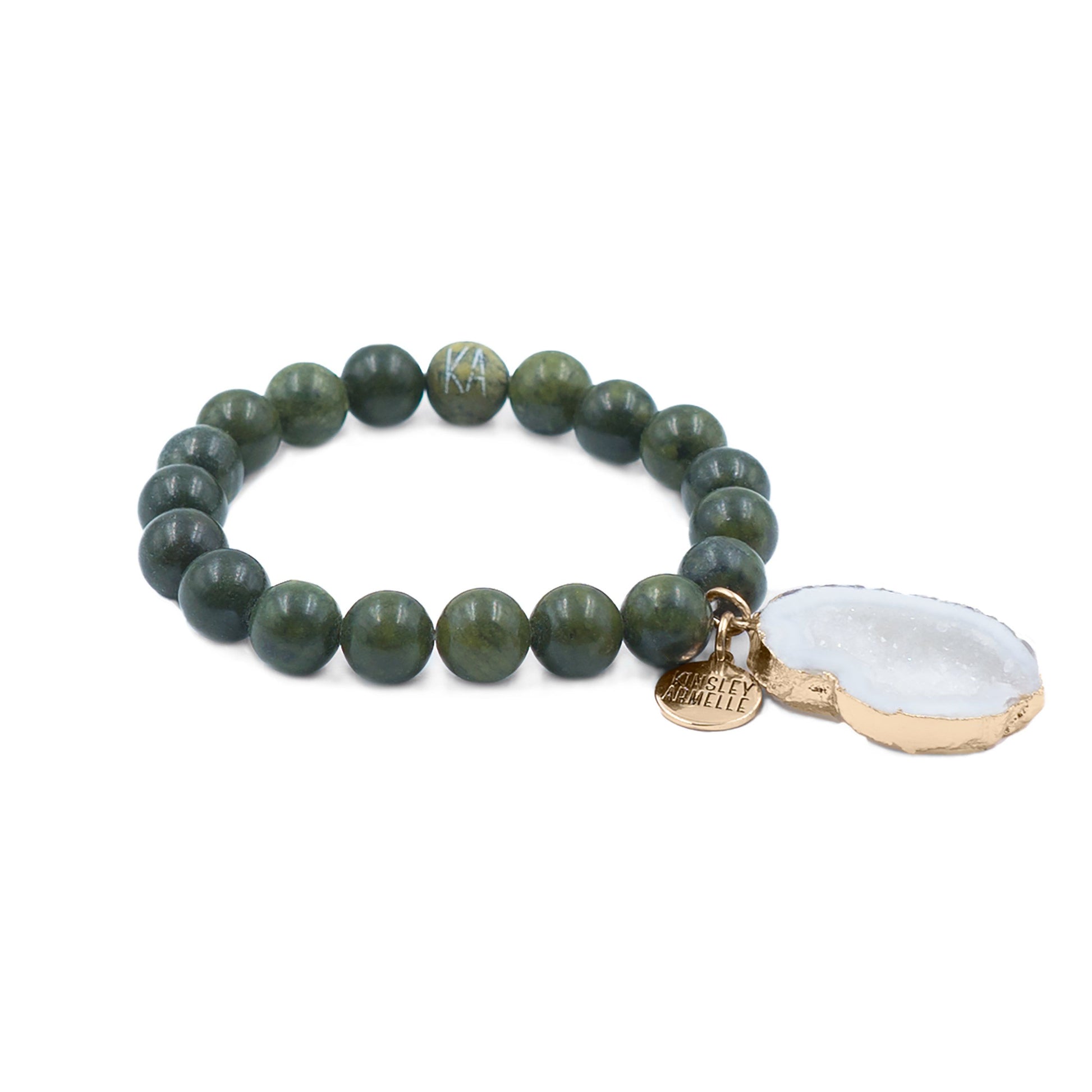 Gold And Green Charm Dangle Glossy Hypoallergenic Nickel Free Beaded Stretch Bracelet. Custom Agate Slices Raw Natural Stone Accents And Designed With Love In Texas. Size Small, Medium, Large, and Extra Large Ranging From 6.25 - 7.25 Inch Circumference With Custom Sizing Available On Select Pieces.