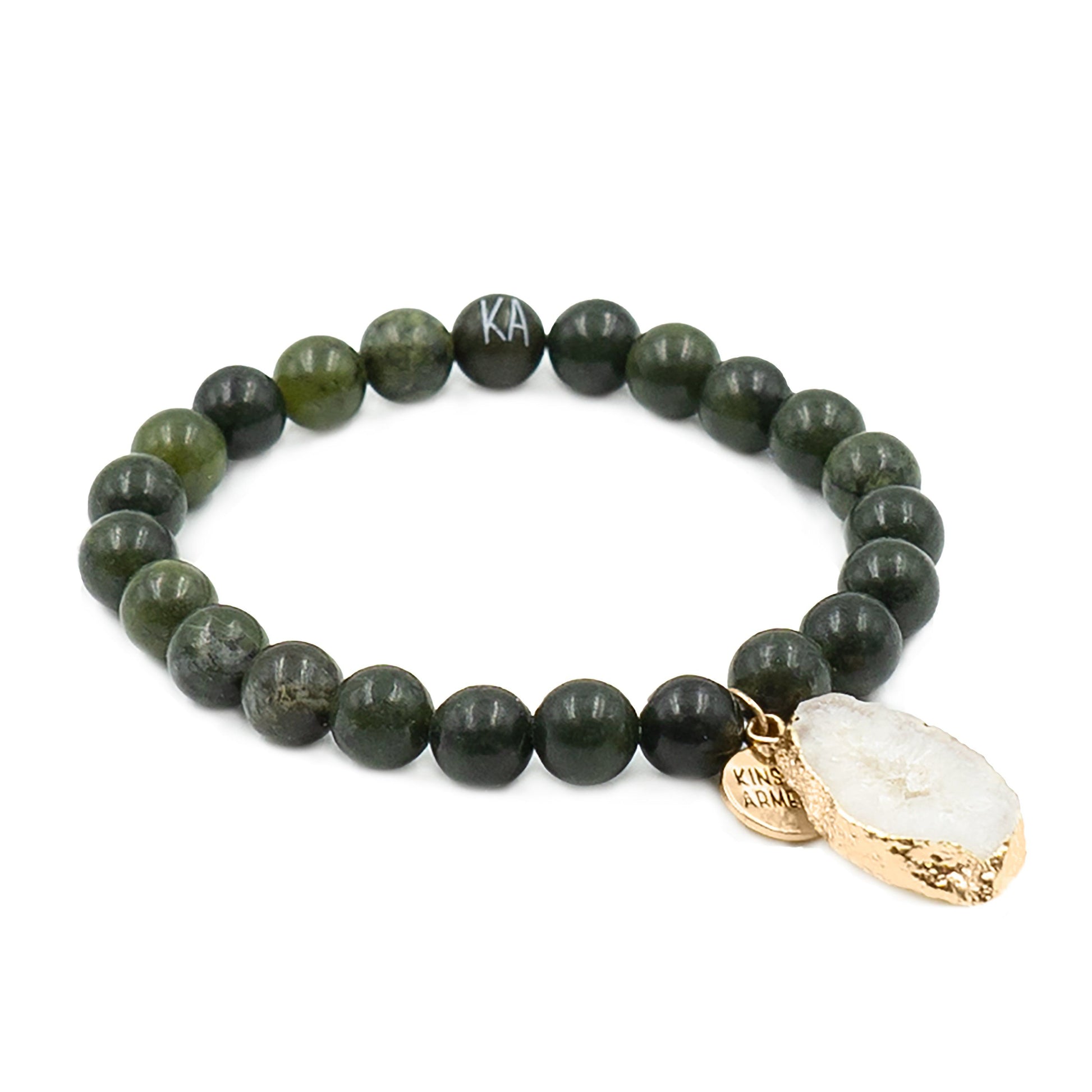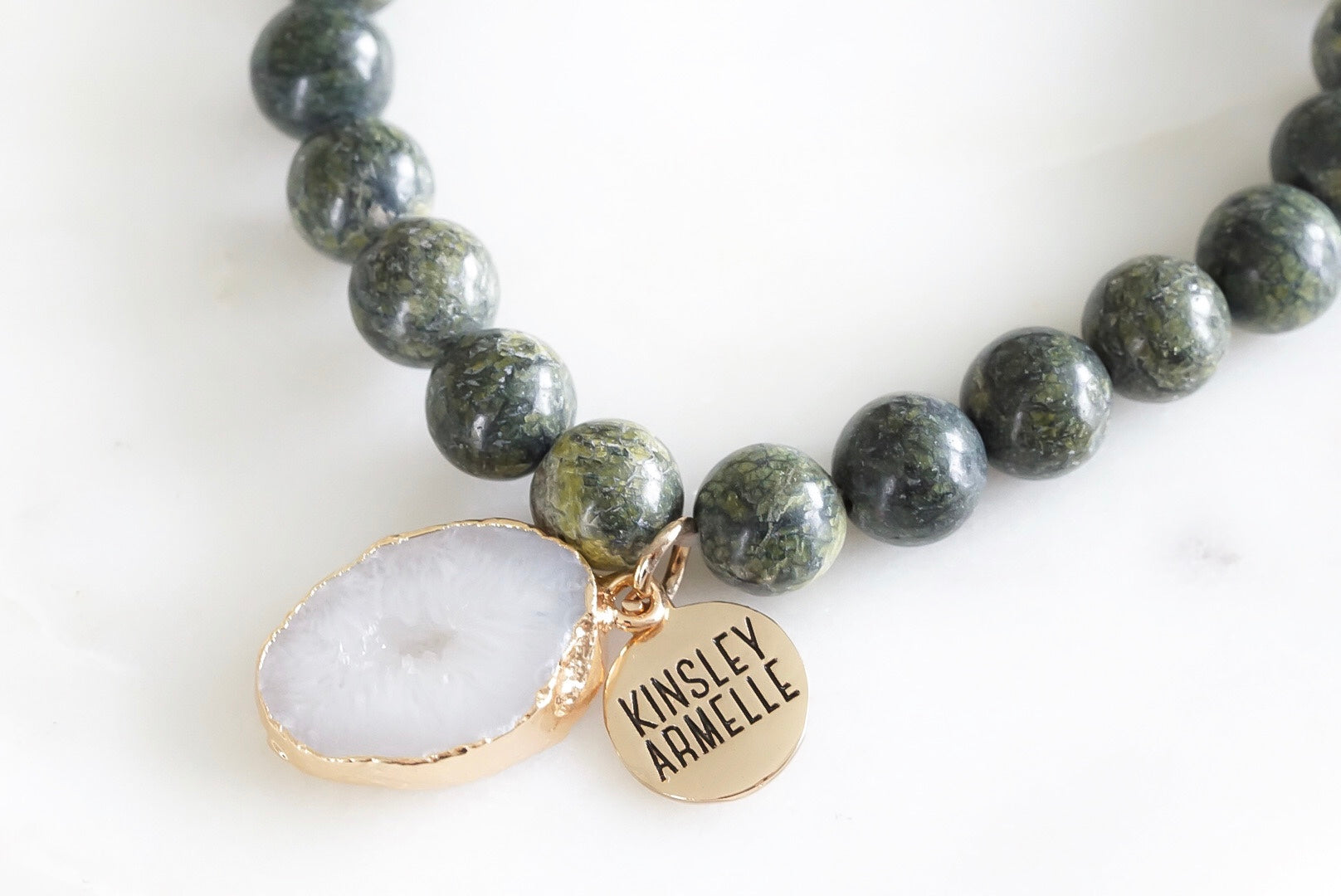 Gold And Green Charm Dangle Glossy Hypoallergenic Nickel Free Beaded Stretch Bracelet. Custom Agate Slices Raw Natural Stone Accents And Designed With Love In Texas. Size Small, Medium, Large, and Extra Large Ranging From 6.25 - 7.25 Inch Circumference With Custom Sizing Available On Select Pieces.