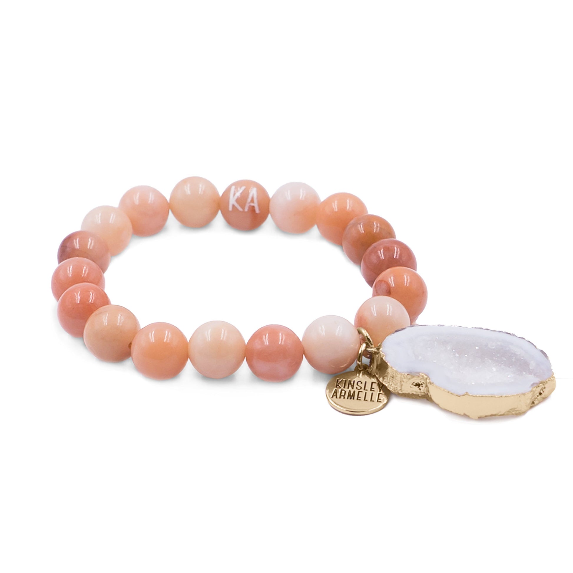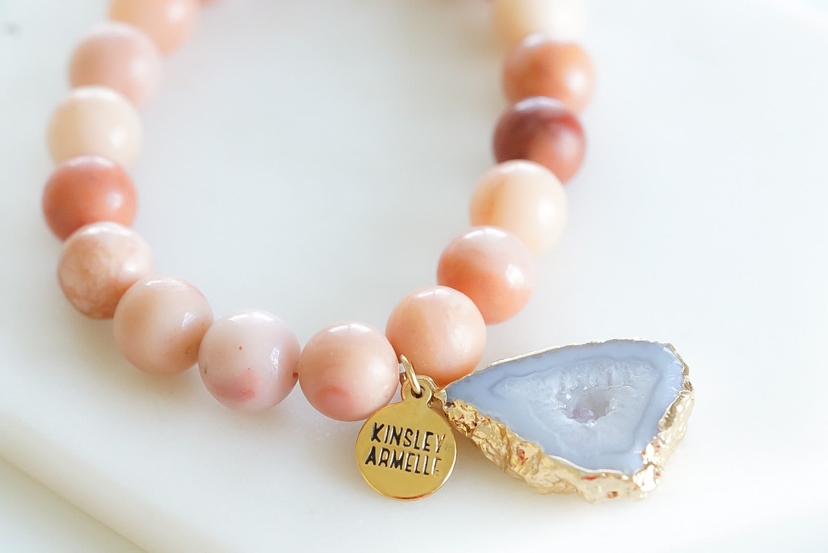 Gold And Pink Charm Dangle Glossy Hypoallergenic Nickel Free Beaded Stretch Bracelet. Custom Agate Slices Raw Natural Stone Accents And Designed With Love In Texas. Size Small, Medium, Large, and Extra Large Ranging From 6.25 - 7.25 Inch Circumference With Custom Sizing Available On Select Pieces.