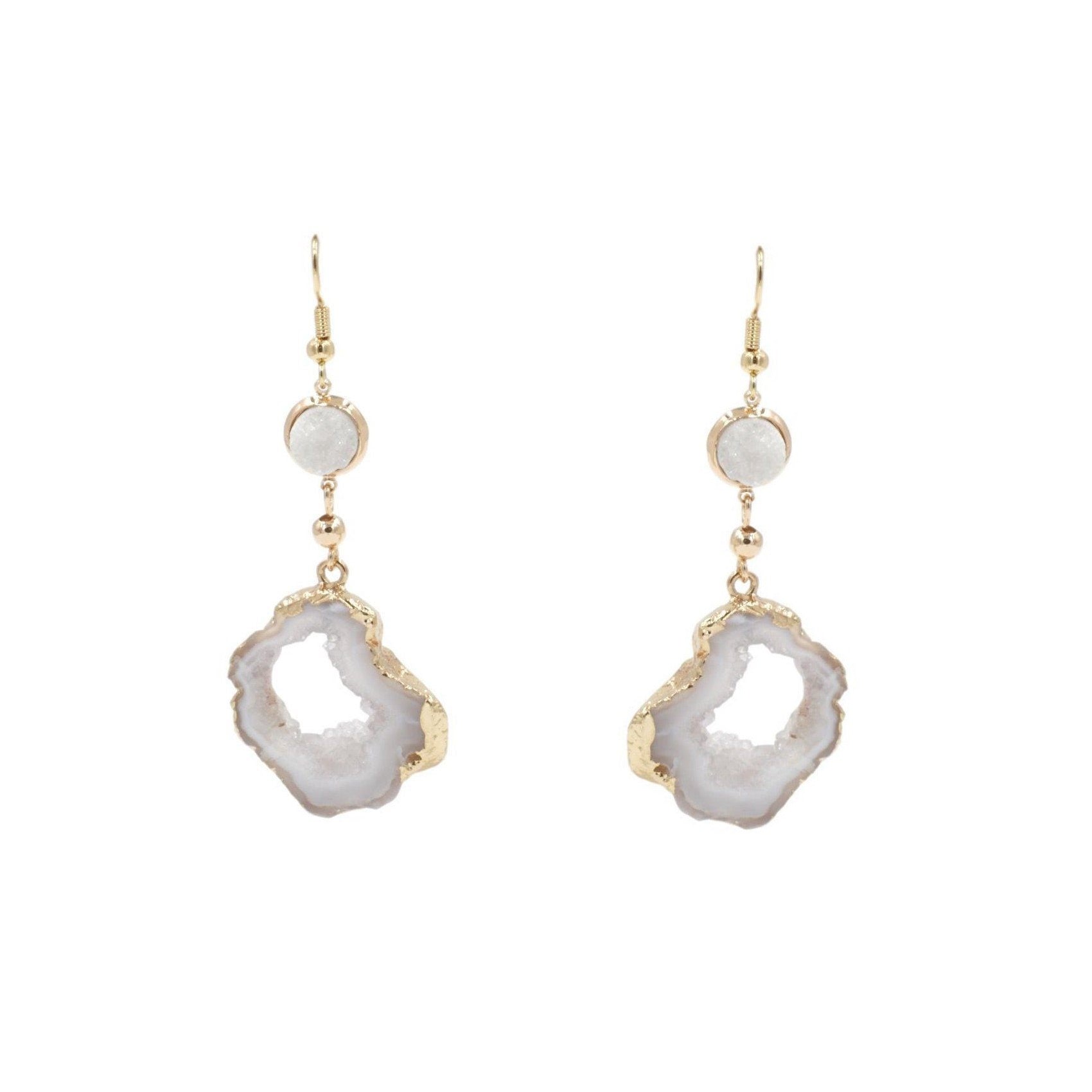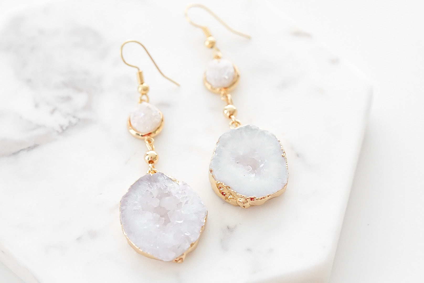 Gold And White Dangle Druzy Tiered Lightweight Hypoallergenic Nickel Free Drop Earrings. Custom Agate Slices Raw Natural Stone Accents And Designed With Love In Texas. Size 2.5 Inch Length x 1 Inch Width With Custom Sizing Available On Select Pieces.