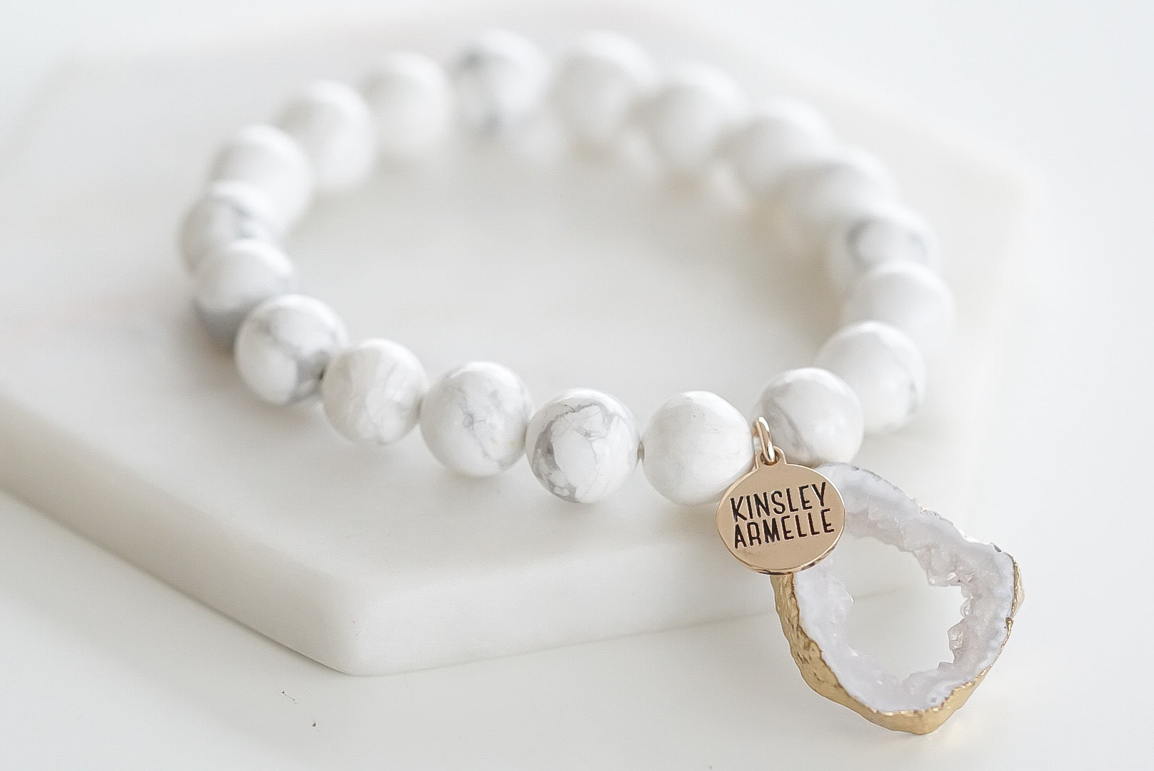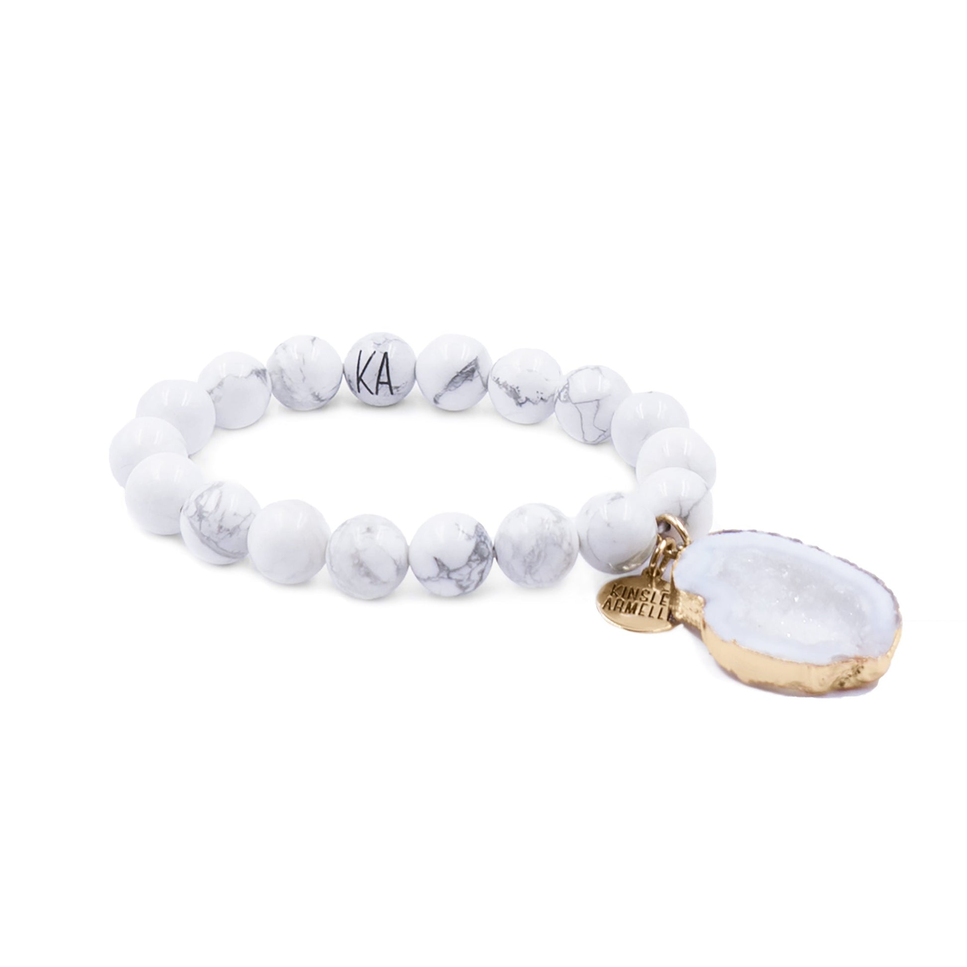 Gold And White Charm Dangle Glossy Hypoallergenic Nickel Free Beaded Stretch Bracelet. Custom Agate Slices Raw Natural Stone Accents And Designed With Love In Texas. Size Small, Medium, Large, and Extra Large Ranging From 6.25 - 7.25 Inch Circumference With Custom Sizing Available On Select Pieces.