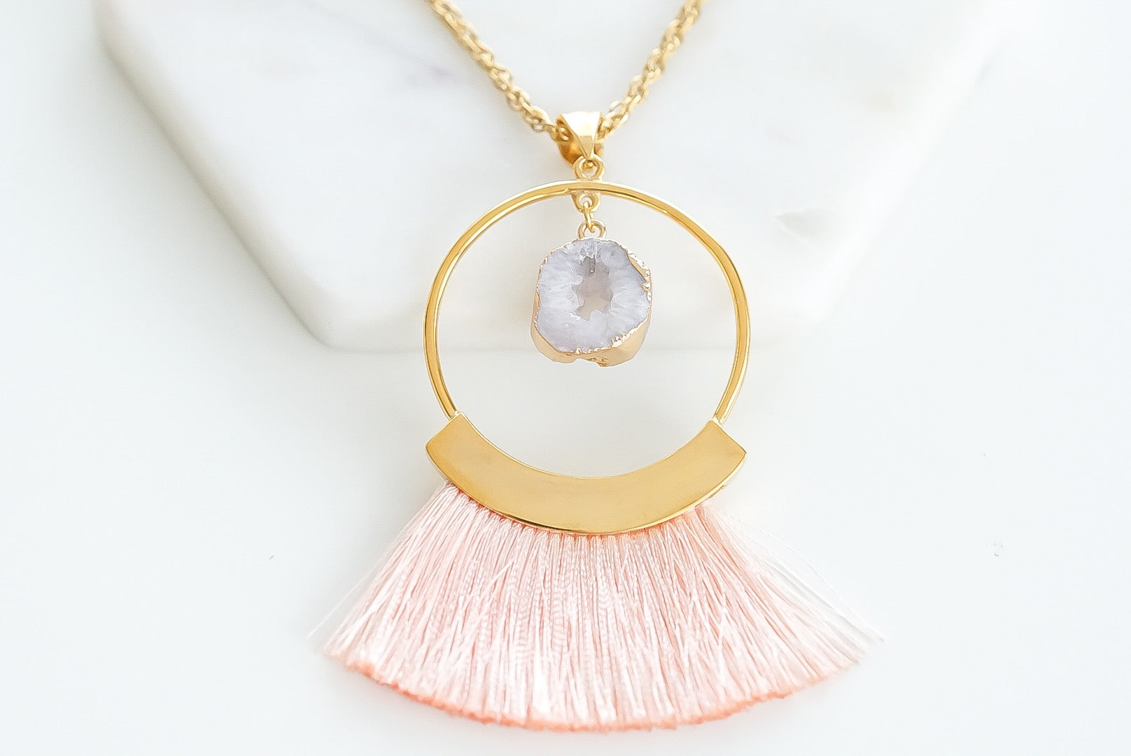 Gold And Pink Dangle Fringe Tassel Hypoallergenic Nickel Free Statement Pendant Necklace. Custom Agate Slices Raw Natural Stone Accents And Designed With Love In Texas. Size 32 Inch Length, Plus 3 Inch Attached Necklace Extender With Custom Sizing Available On Select Pieces.