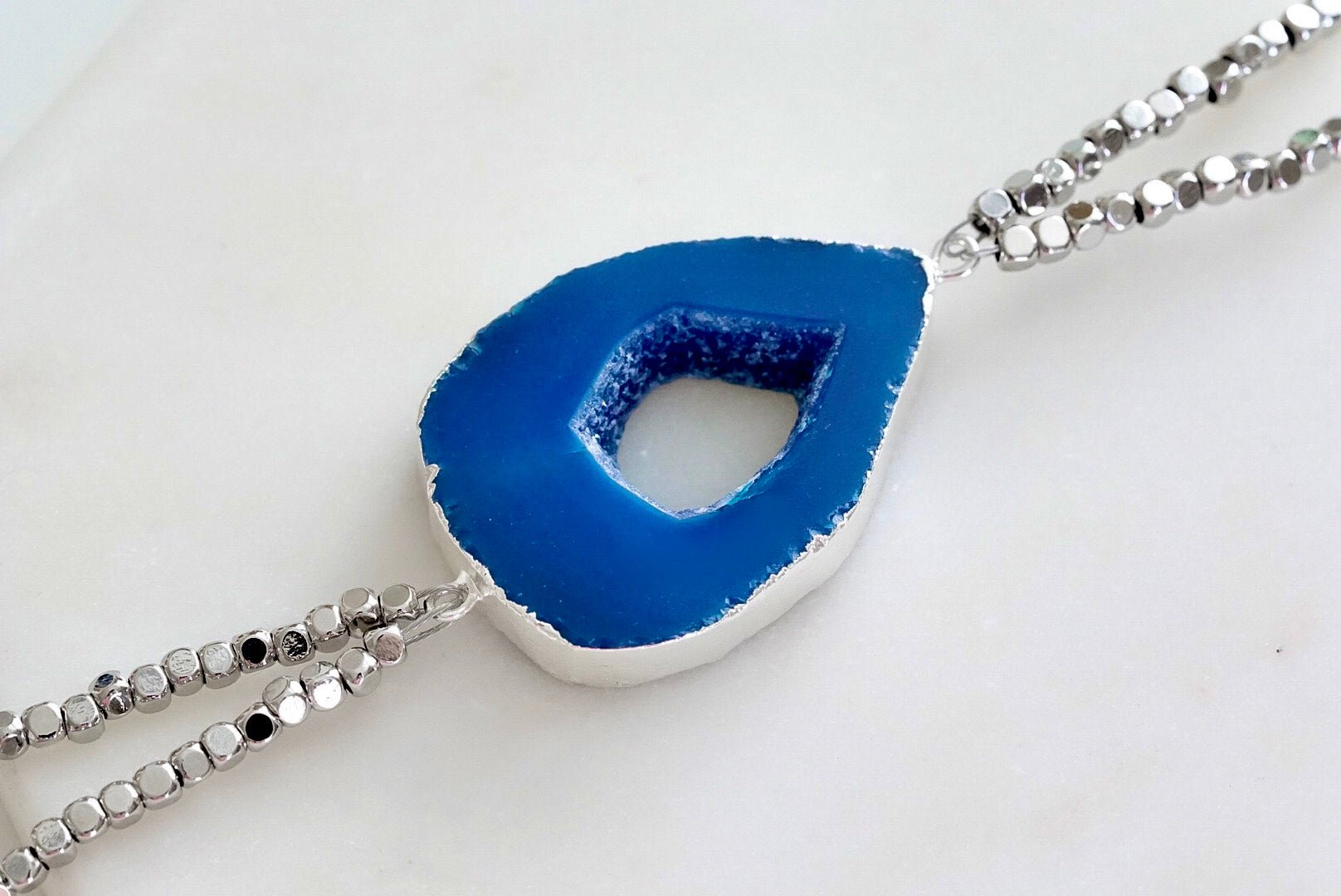 Silver And Blue Chain Clasp Natural Stone Hypoallergenic Nickel Free Adjustable Bracelet. Custom Agate Slices Raw Natural Stone Accents And Designed With Love In Texas. Size 6.75 - 8.75 Inch Circumference With Custom Sizing Available On Select Pieces.