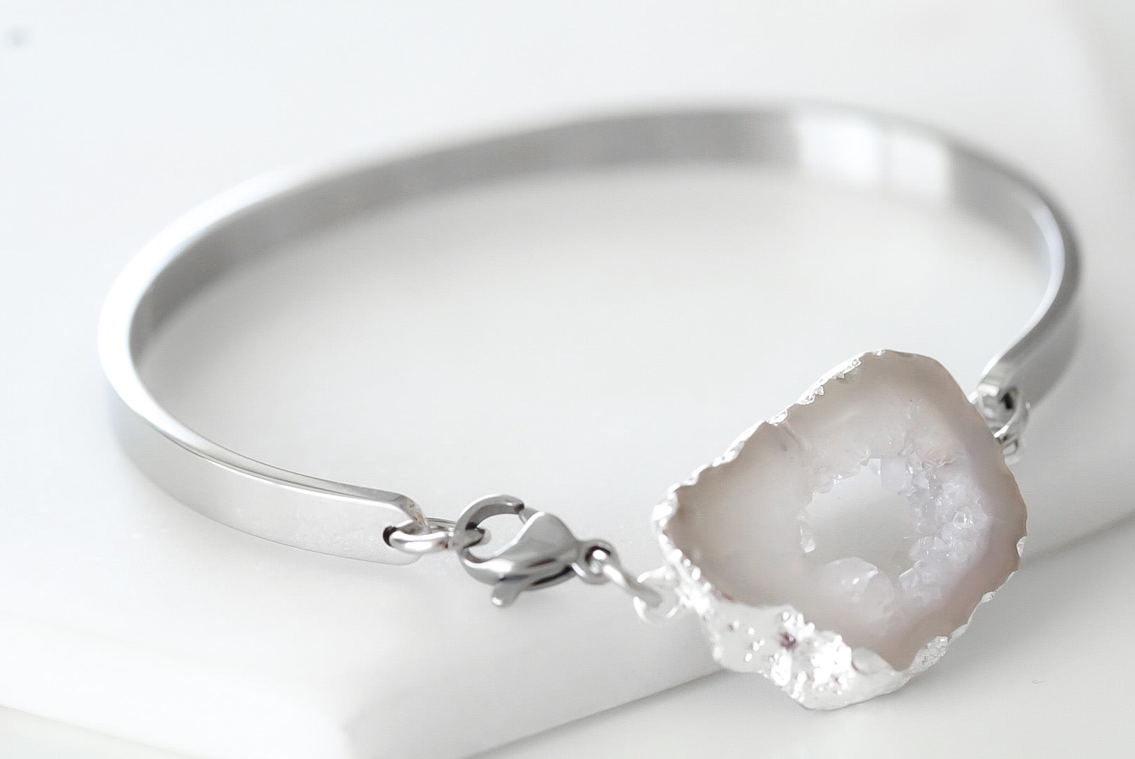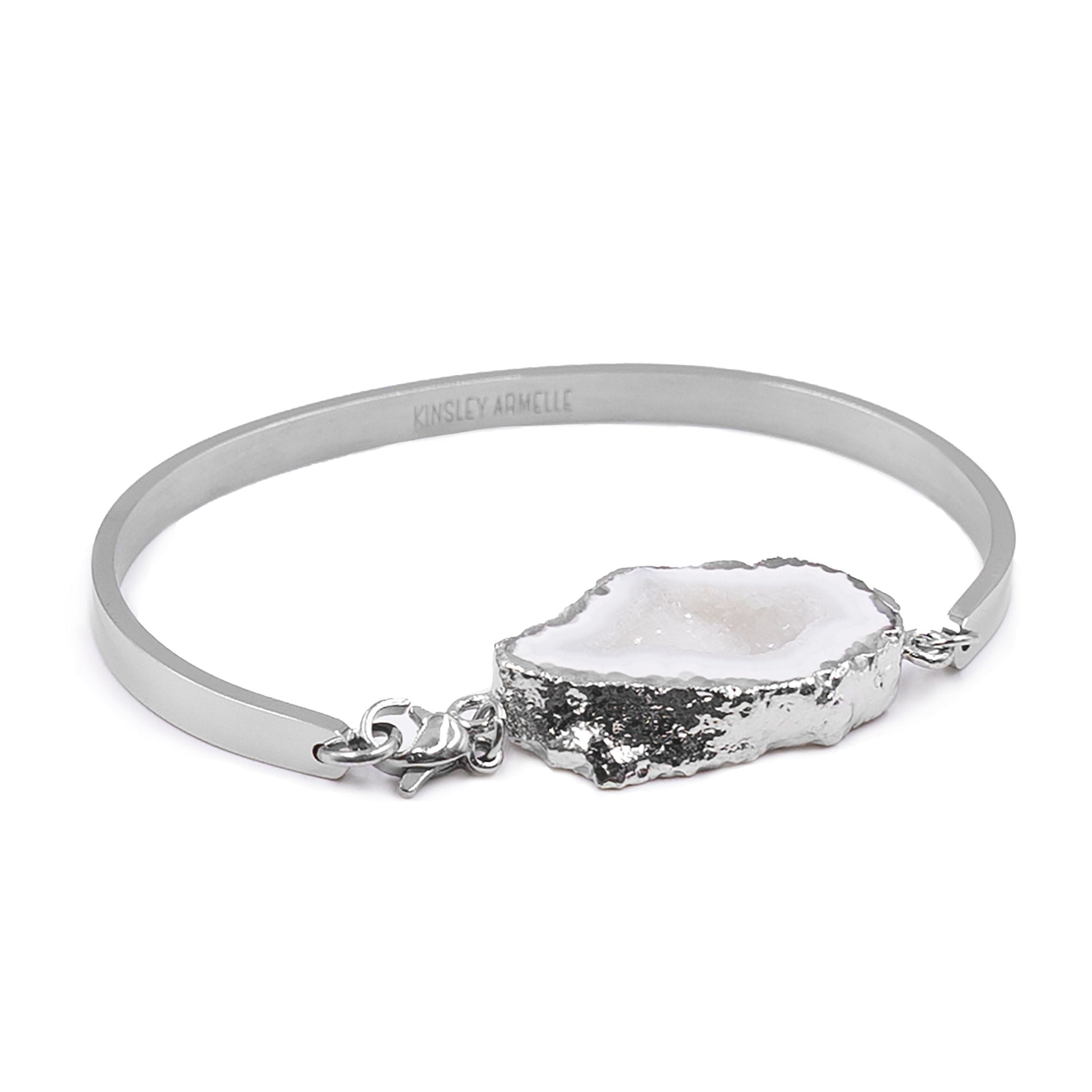 Silver And Gray Natural Stone Hypoallergenic Nickel Free Bangle Cuff Bracelet. Custom Agate Slices Raw Natural Stone Accents And Designed With Love In Texas. Size Small, Medium, Large, and Extra Large Ranging From 6.25 - 7.25 Inch Circumference With Custom Sizing Available On Select Pieces.