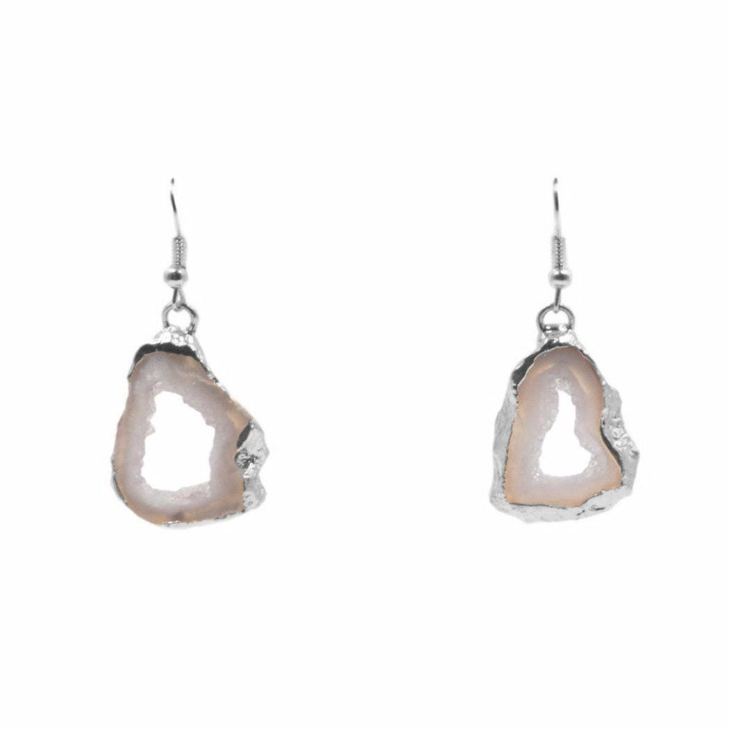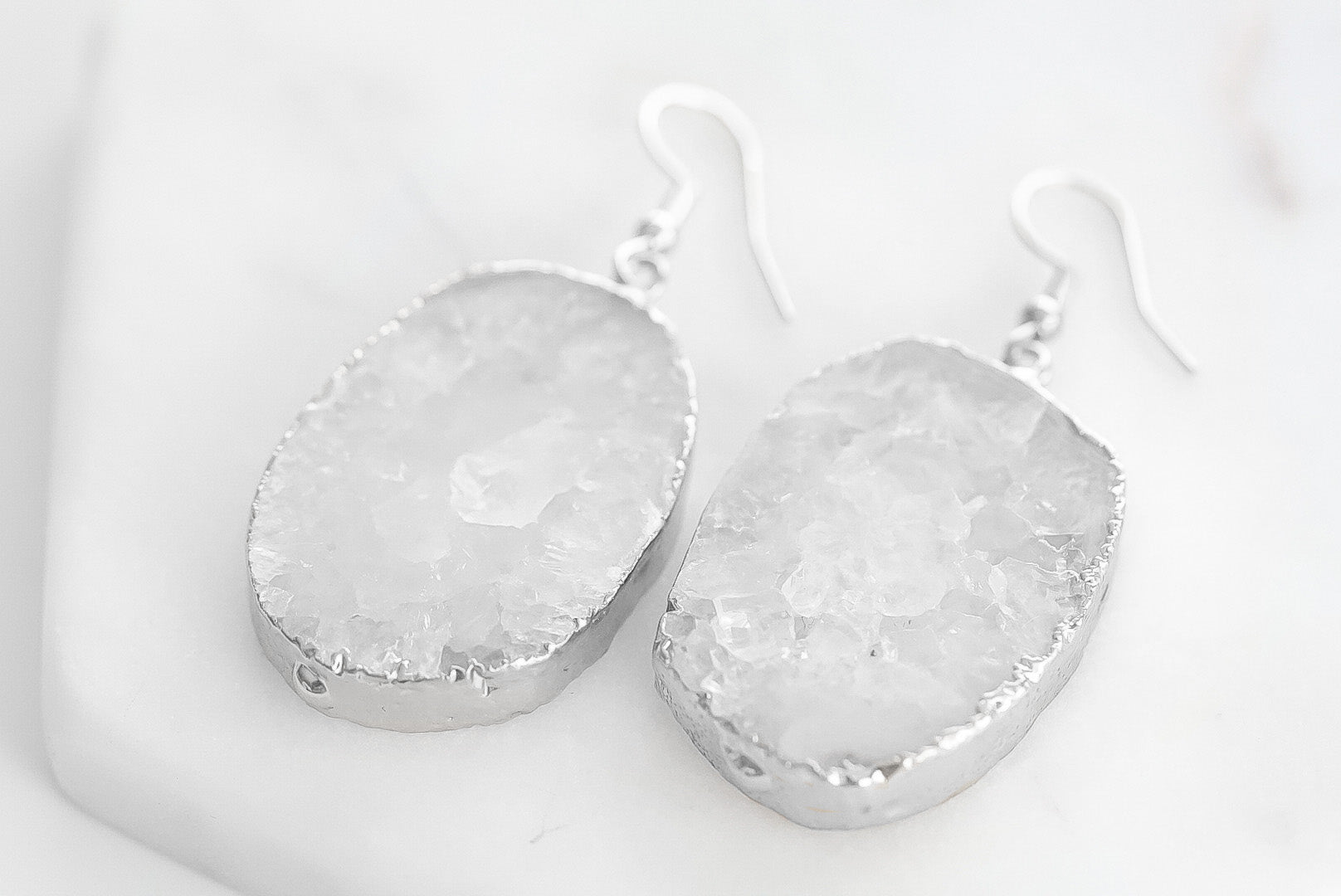 Silver And White Dangle Lightweight Hypoallergenic Nickel Free Drop Earrings. Custom Agate Slices Raw Natural Stone Accents And Designed With Love In Texas. Size 1.5 Inches Length x 1 Inch Width With Custom Sizing Available On Select Pieces.