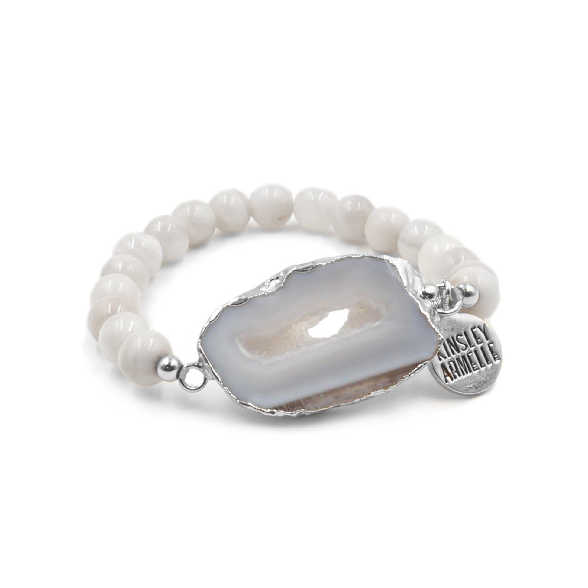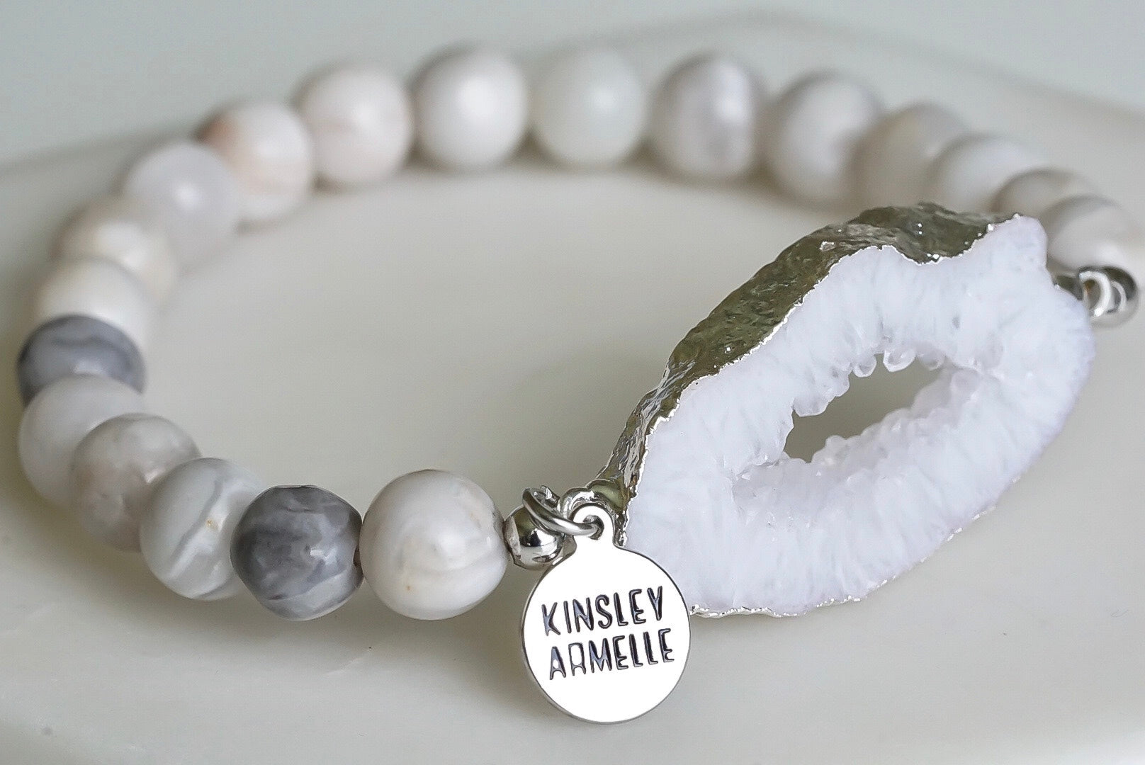 Silver And White Natural Stone Hypoallergenic Nickel Free Beaded Stretch Bracelet. Custom Agate Slices Raw Natural Stone Accents And Designed With Love In Texas. Size Small, Medium, Large, and Extra Large Ranging From 6.25 - 7.25 Inch Circumference With Custom Sizing Available On Select Pieces.