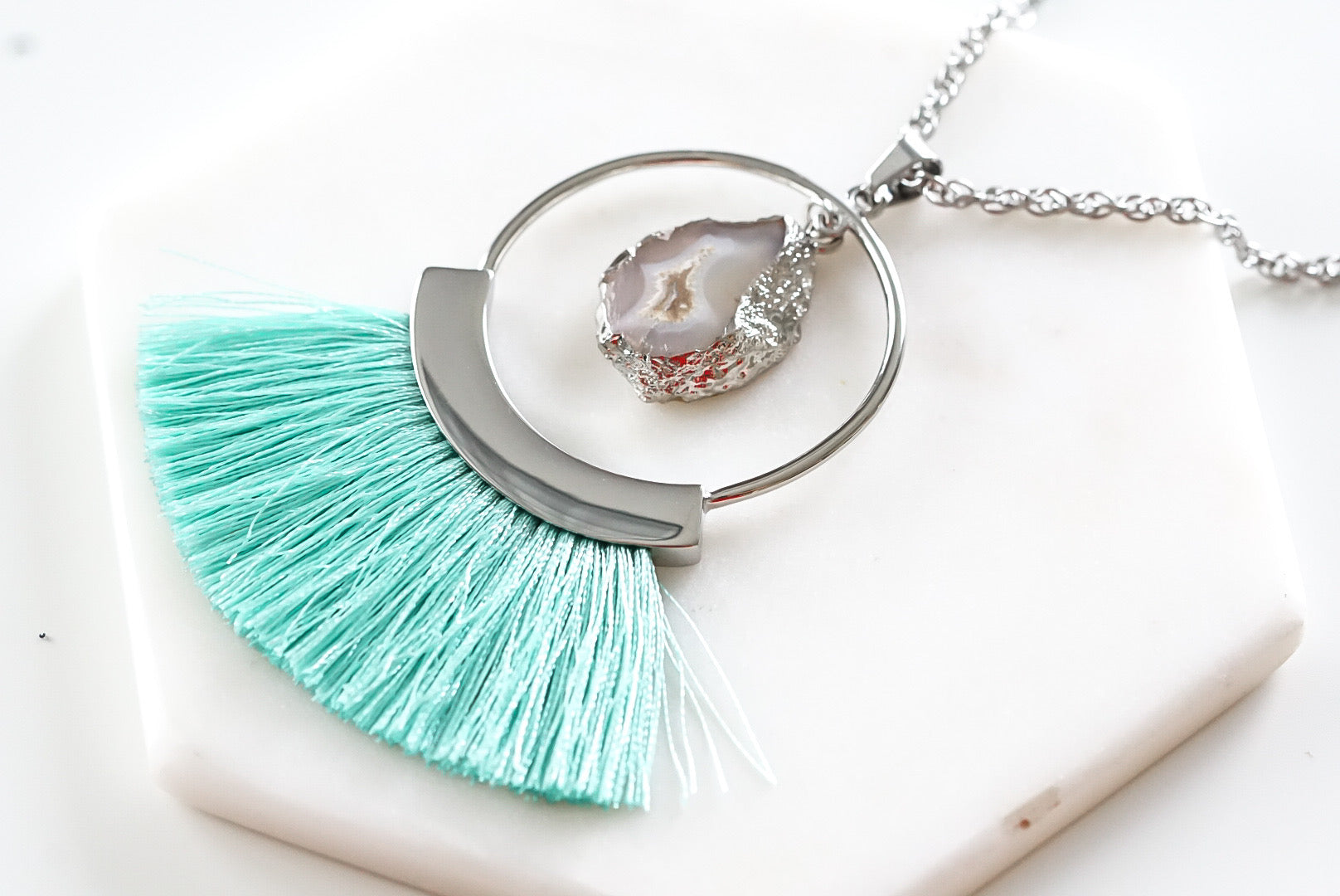 Silver And Light Blue Dangle Fringe Tassel Hypoallergenic Nickel Free Statement Pendant Necklace. Custom Agate Slices Raw Natural Stone Accents And Designed With Love In Texas. Size 32 Inch Length, Plus 3 Inch Attached Necklace Extender With Custom Sizing Available On Select Pieces.