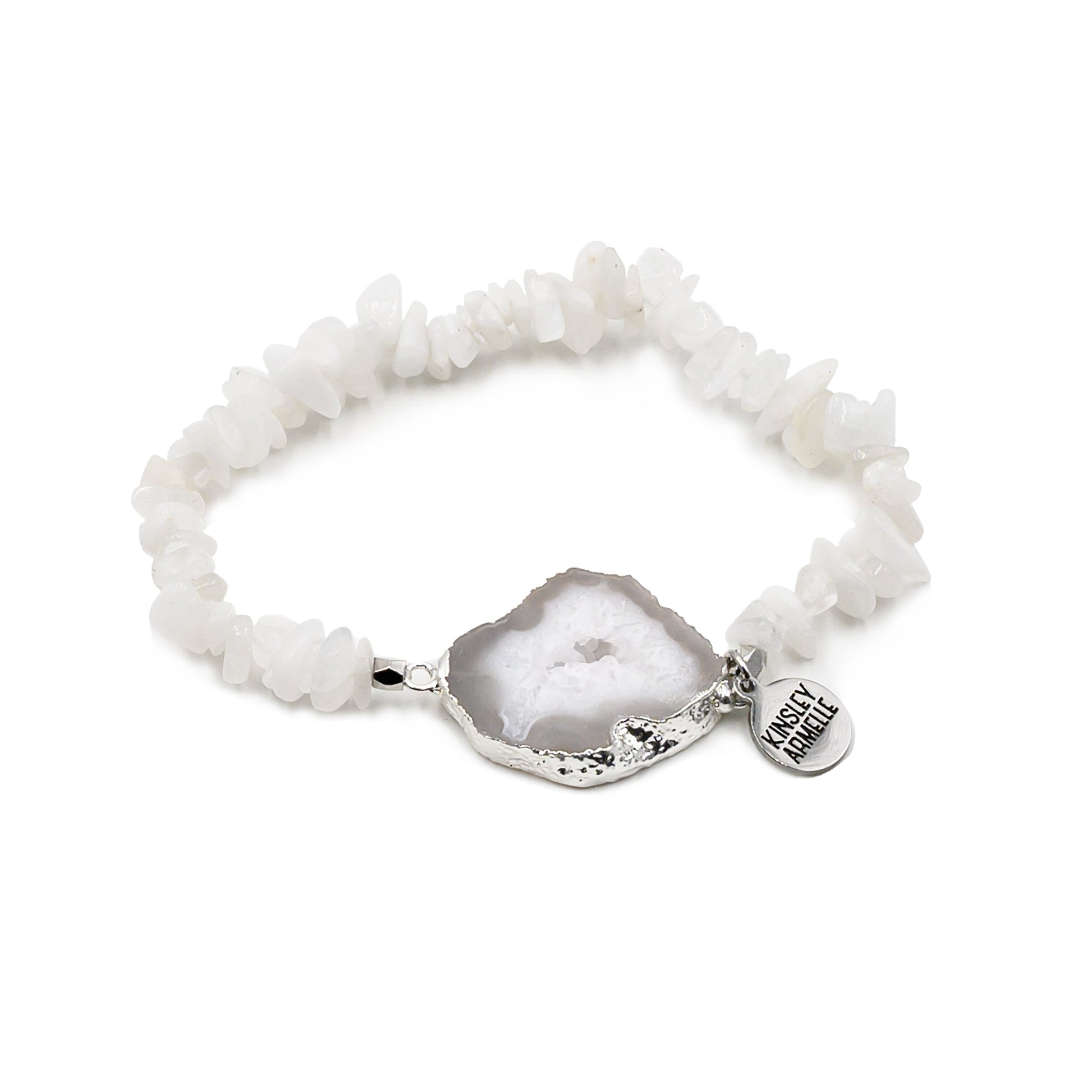 Silver And White Boho Chip Shell Hypoallergenic Nickel Free Beaded Stretch Bracelet. Custom Agate Slices Raw Natural Stone Accents And Designed With Love In Texas. Size Small, Medium, Large, and Extra Large Ranging From 6.25 - 7.25 Inch Circumference With Custom Sizing Available On Select Pieces.