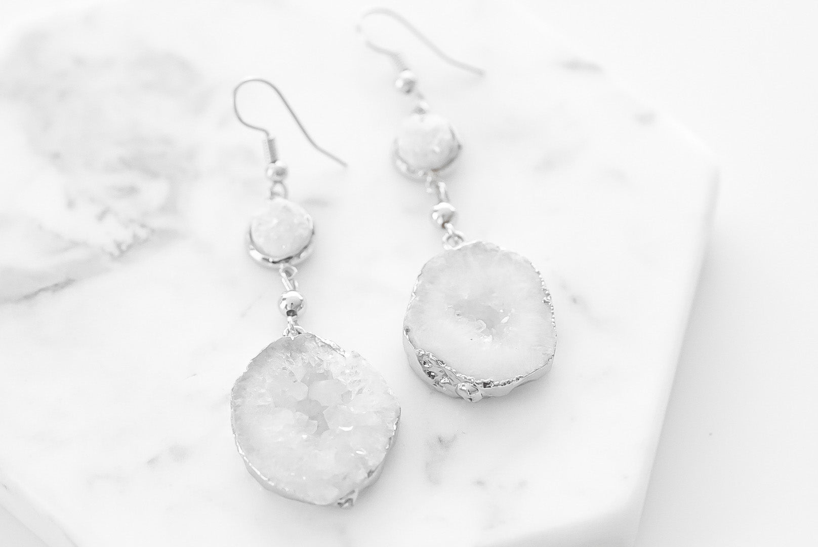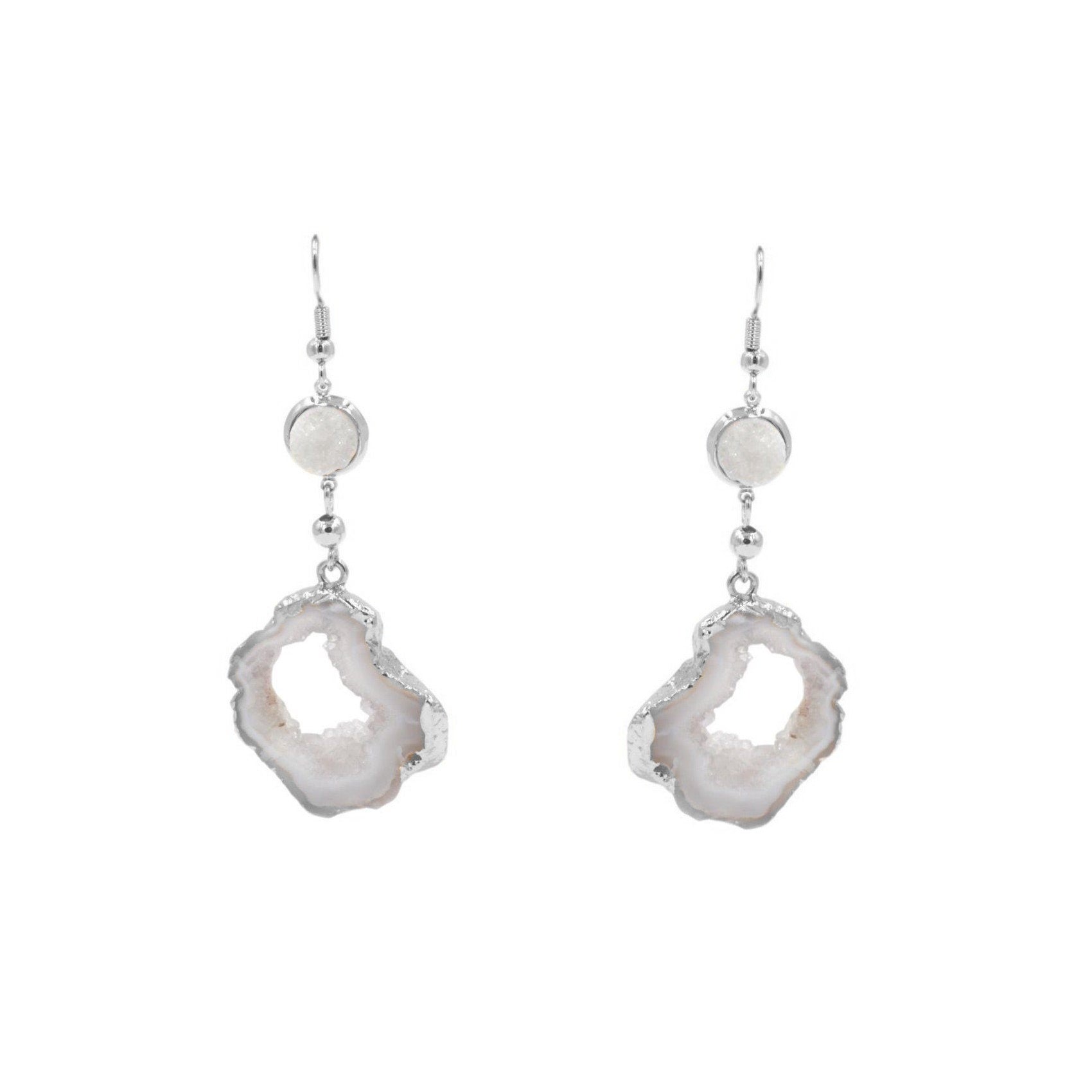 Silver And White Dangle Druzy Tiered Lightweight Hypoallergenic Nickel Free Drop Earrings. Custom Agate Slices Raw Natural Stone Accents And Designed With Love In Texas. Size 2.5 Inch Length x 1 Inch Width With Custom Sizing Available On Select Pieces.