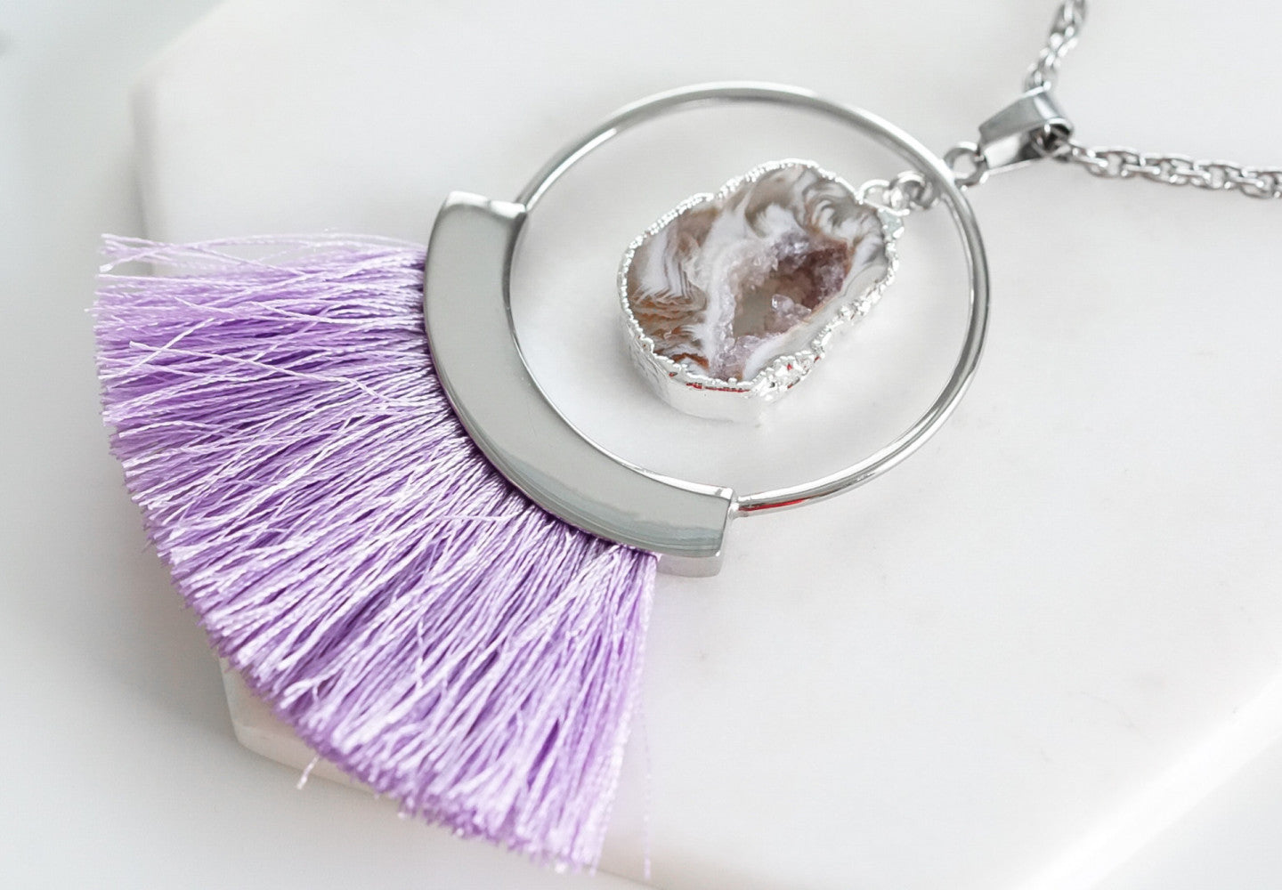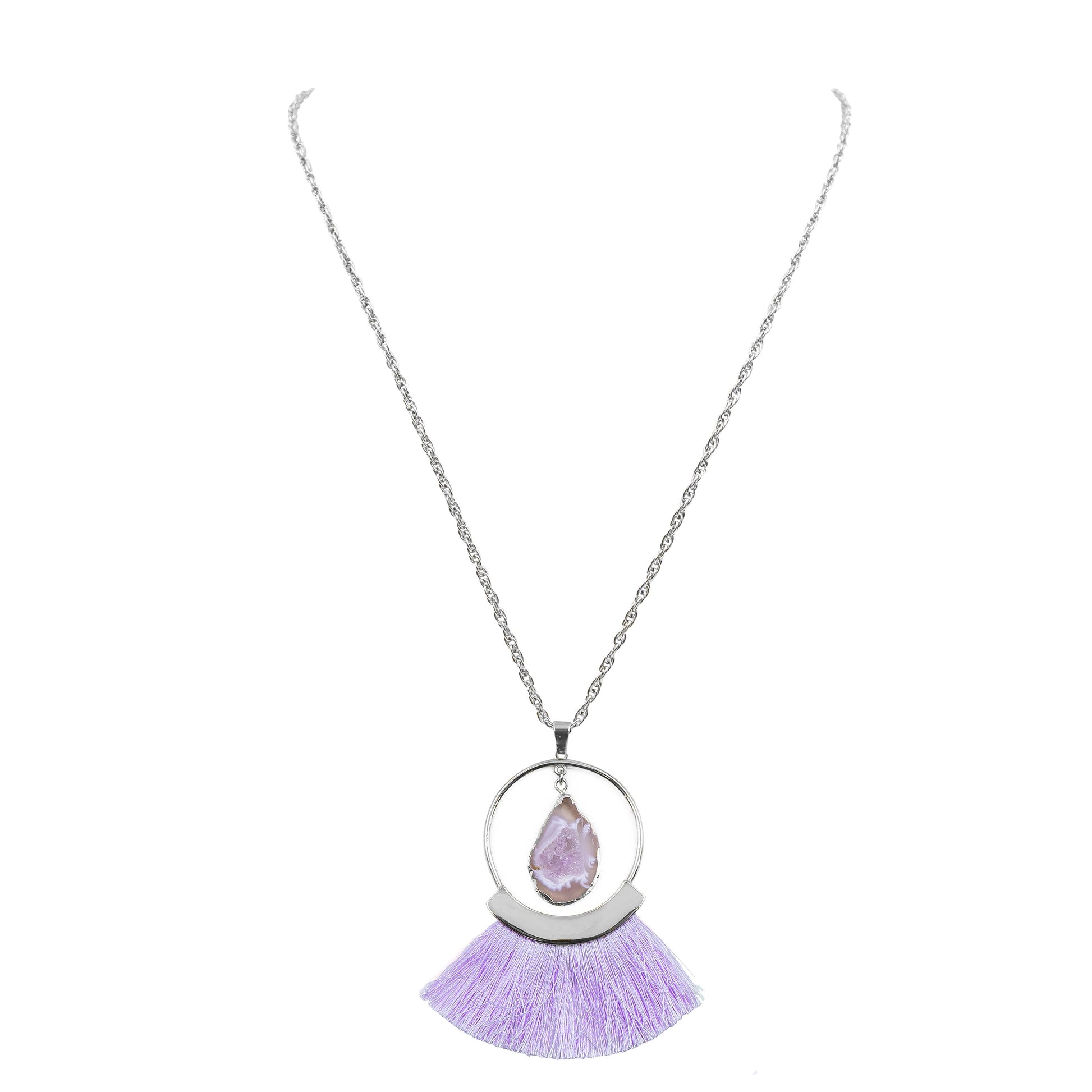Silver And Purple Dangle Fringe Tassel Hypoallergenic Nickel Free Statement Pendant Necklace. Custom Agate Slices Raw Natural Stone Accents And Designed With Love In Texas. Size 32 Inch Length, Plus 3 Inch Attached Necklace Extender With Custom Sizing Available On Select Pieces.