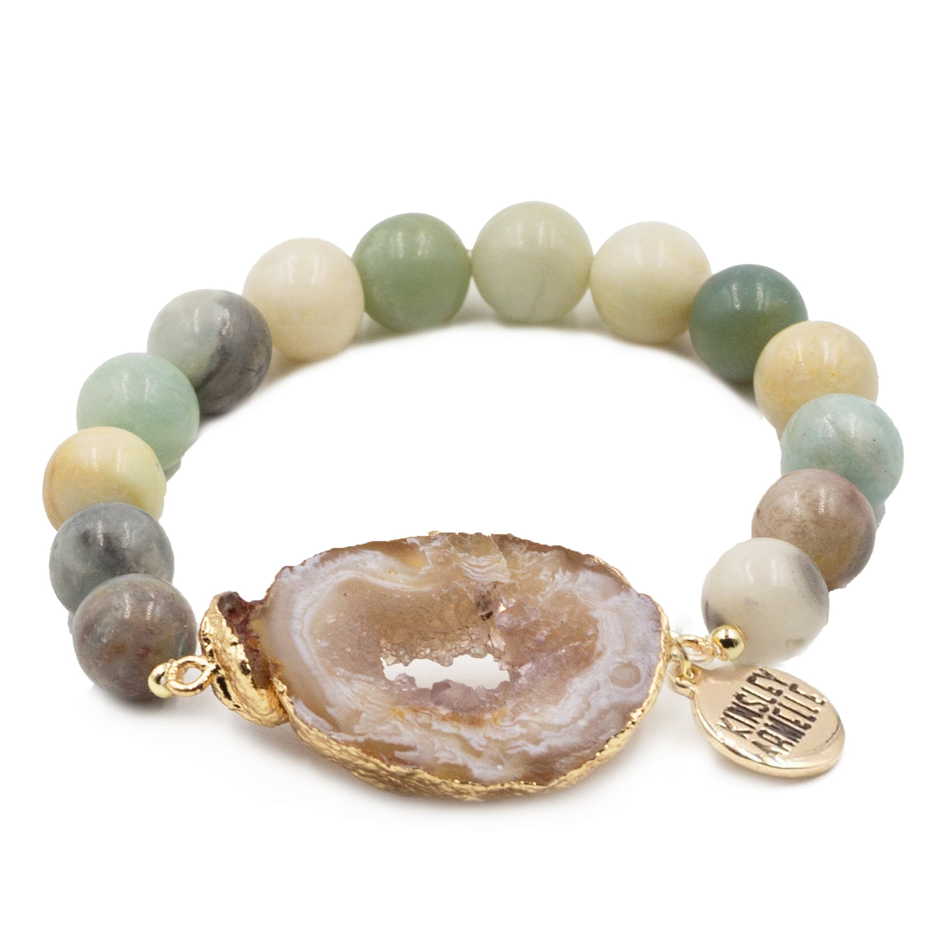 Gold And Light Blue Multicolored Natural Stone Hypoallergenic Nickel Free Beaded Stretch Bracelet. Custom Agate Slices Raw Natural Stone Accents And Designed With Love In Texas. Size Small, Medium, Large, and Extra Large Ranging From 6.25 - 7.25 Inch Circumference With Custom Sizing Available On Select Pieces.