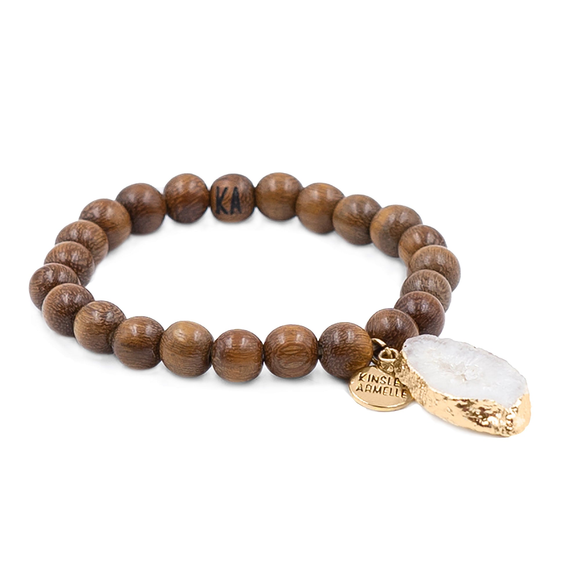 Gold And Brown Charm Dangle Matte Wooden Hypoallergenic Nickel Free Beaded Stretch Bracelet. Custom Agate Slices Raw Natural Stone Accents And Designed With Love In Texas. Size Small, Medium, Large, and Extra Large Ranging From 6.25 - 7.25 Inch Circumference With Custom Sizing Available On Select Pieces.