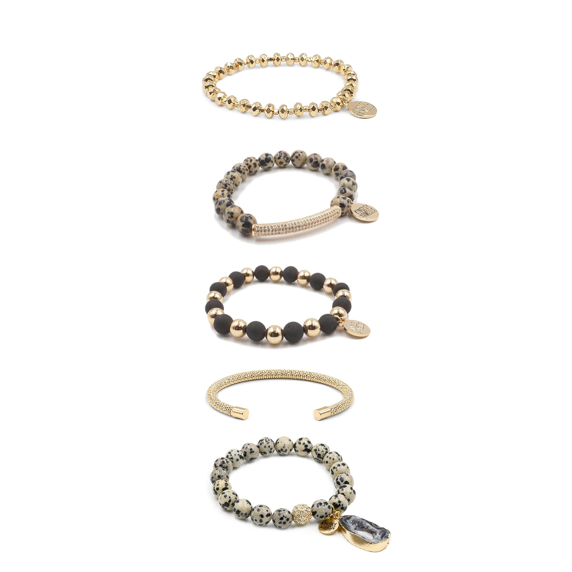 Gold And Black Beads Cheetah Cuff Leaf Feather Leopard Pave Hypoallergenic Nickel Free Bracelet Stack Set. Custom Zircon Gemstones Pave Rhinestone Bar Accents And Designed With Love In Texas. Size Small, Medium, Large, and Extra Large Ranging From 6.25 - 7.25 Inch Circumference With Custom Sizing Available On Select Pieces.