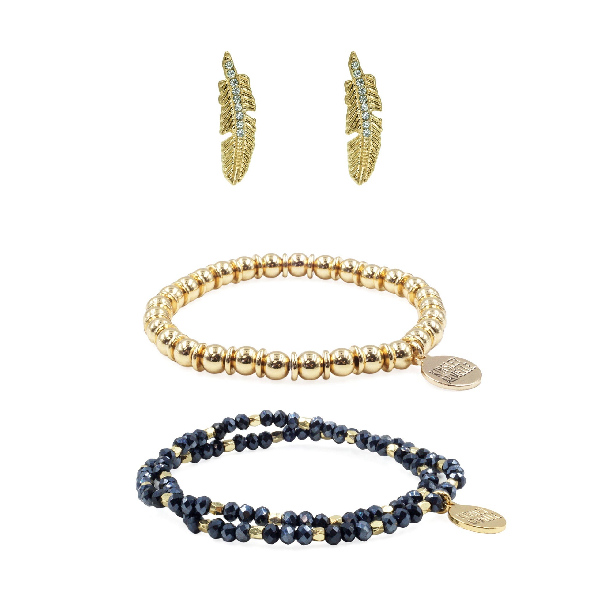 Gold And Blue Hypoallergenic Nickel Free Jewelry & Bracelet Stack Set. Custom 18K Yellow Gold Ion Plated Stainless Steel Charm Accents And Designed With Love In Texas. Size Variations With Custom Sizing Available On Select Pieces.