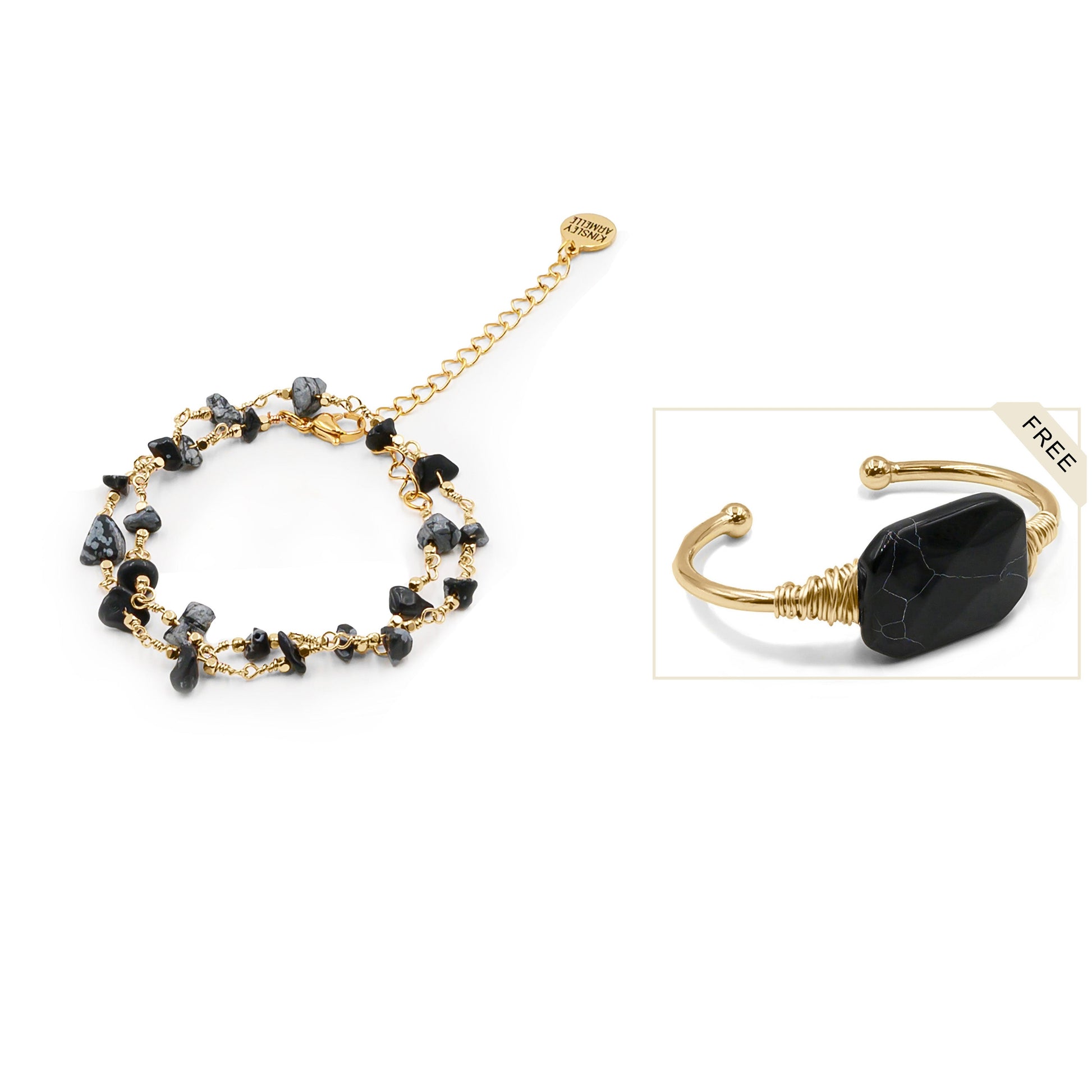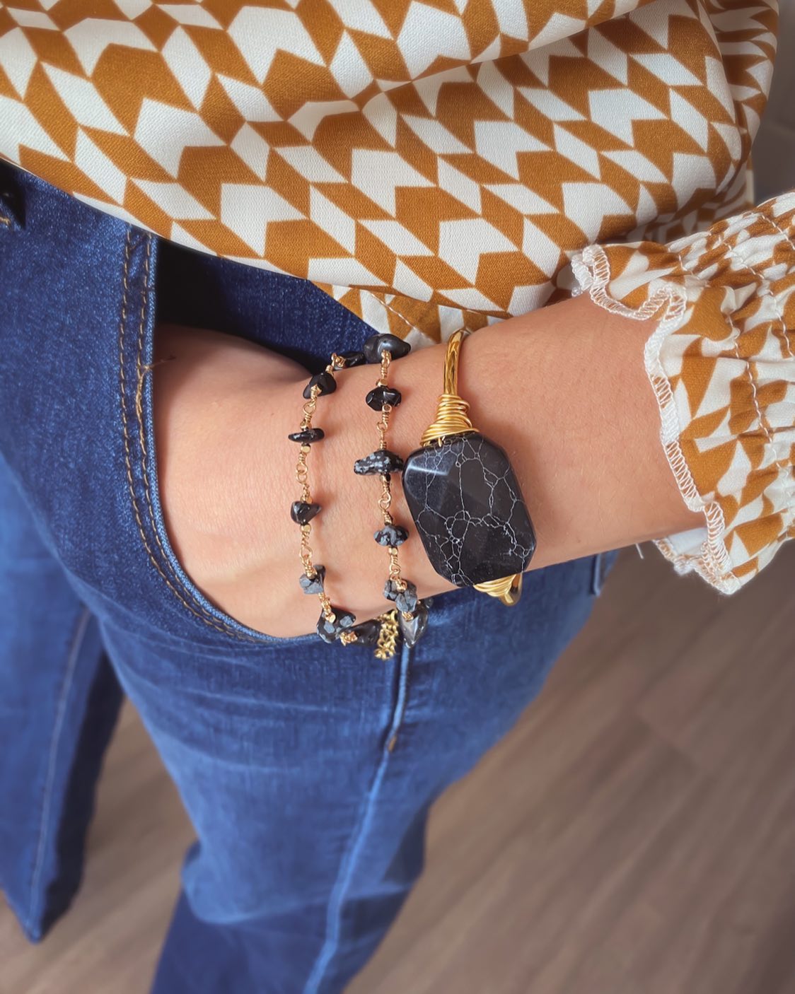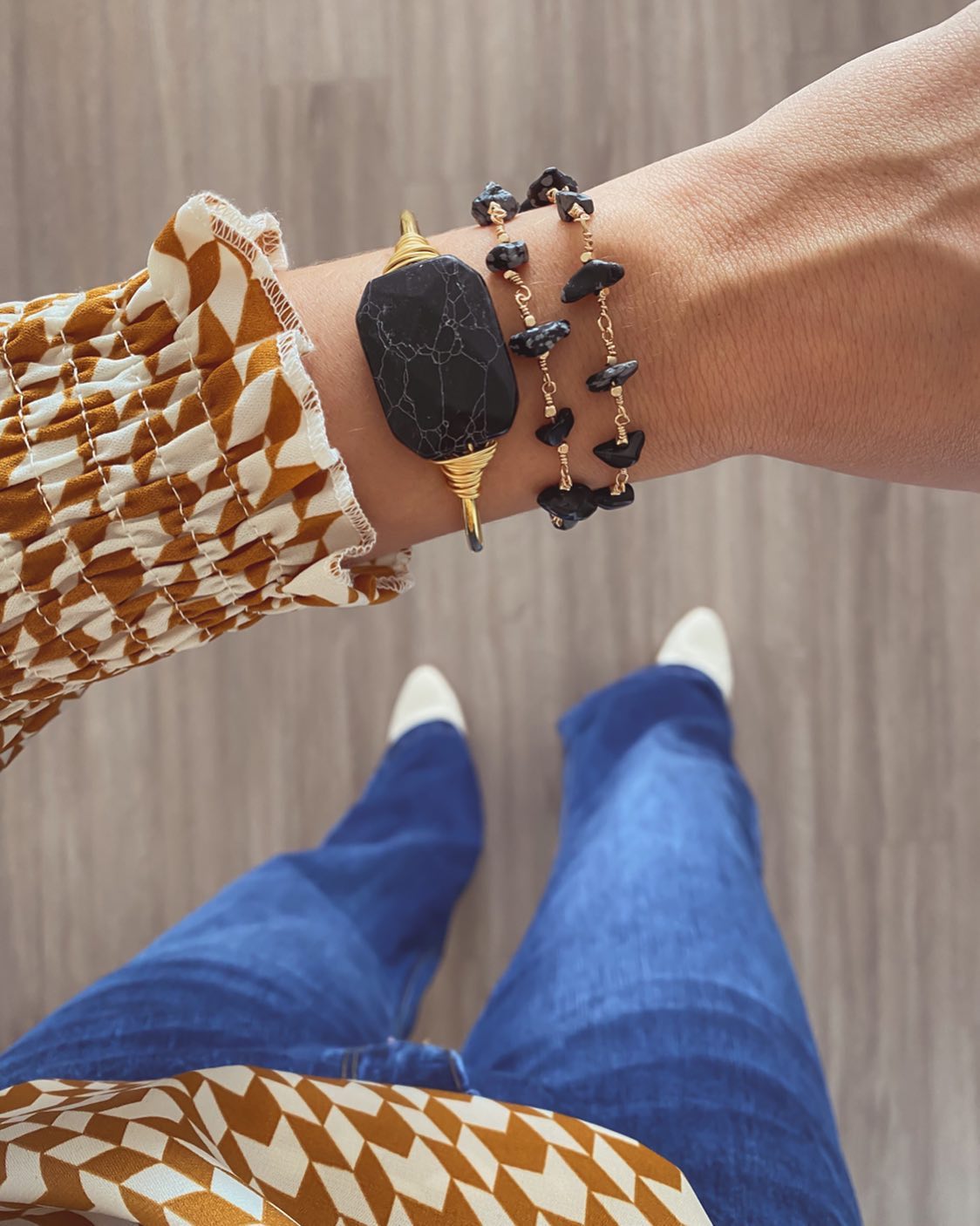 Gold And Black Adjustable Cuff Natural Stone Nugget Station Wire Wrapped Hypoallergenic Nickel Free Bracelet Stack Set. Custom Raw Natural Stone Accents And Designed With Love In Texas. Size Small, Medium, Large, and Extra Large Ranging From 6.25 - 7.25 Inch Circumference With Custom Sizing Available On Select Pieces.