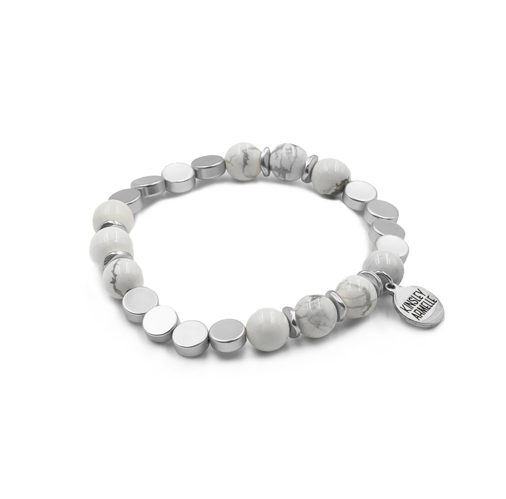 Silver And White Disc Marble Hypoallergenic Nickel Free Beaded Stretch Bracelet. Custom Decorative Accent Beads Accents And Designed With Love In Texas. Size Small, Medium, Large, and Extra Large Ranging From 6.25 - 7.25 Inch Circumference With Custom Sizing Available On Select Pieces.