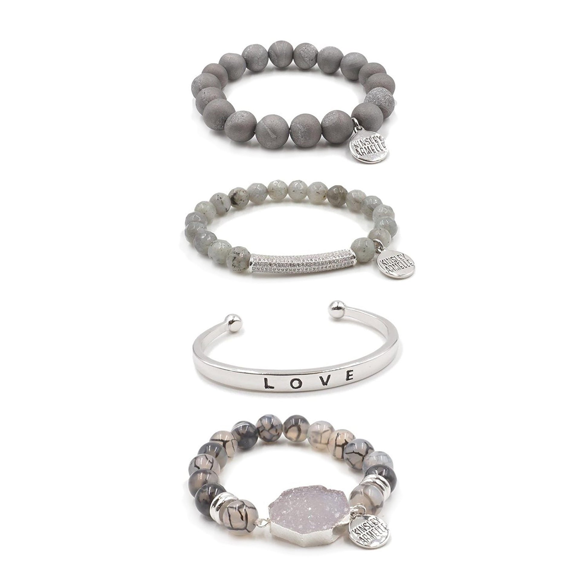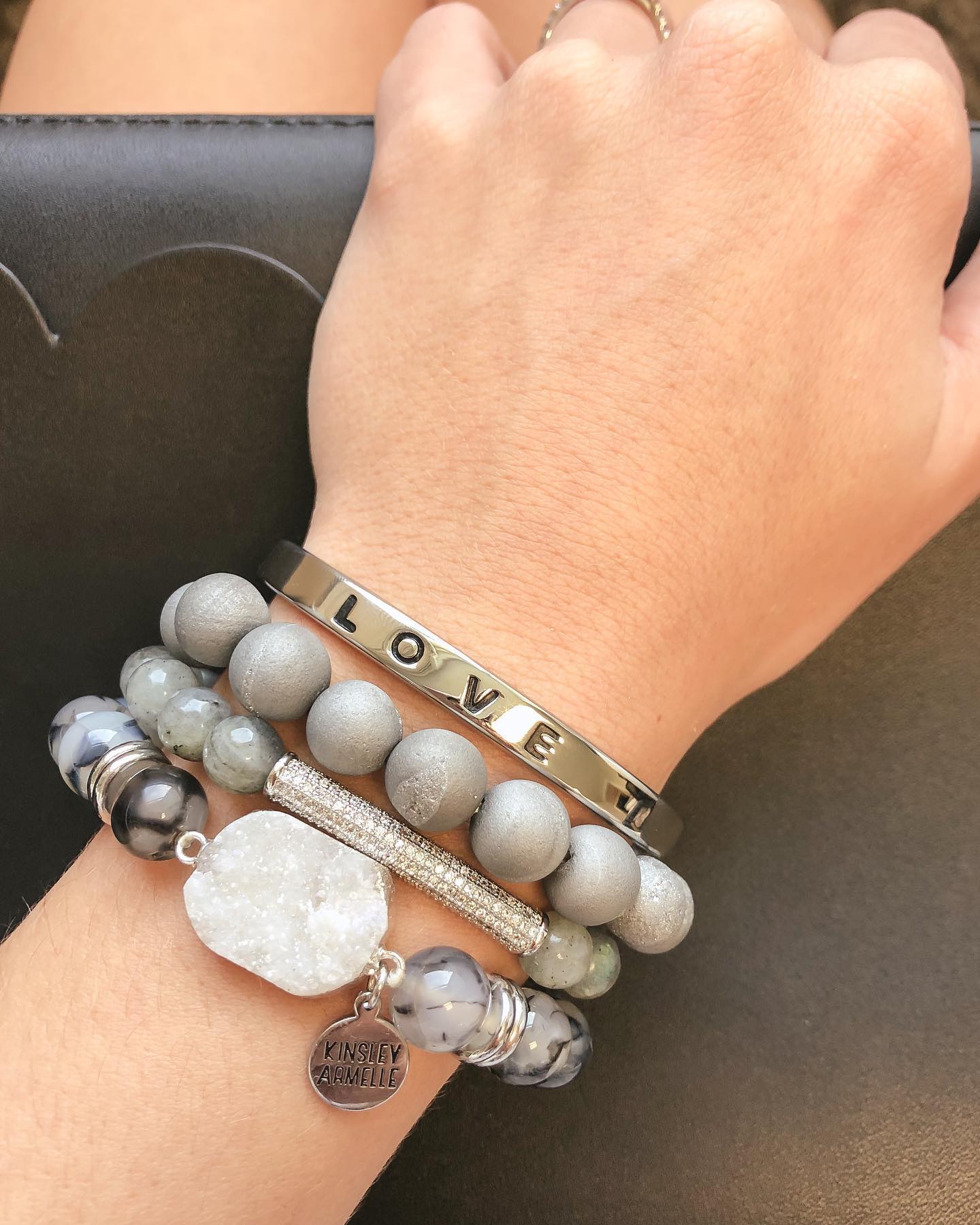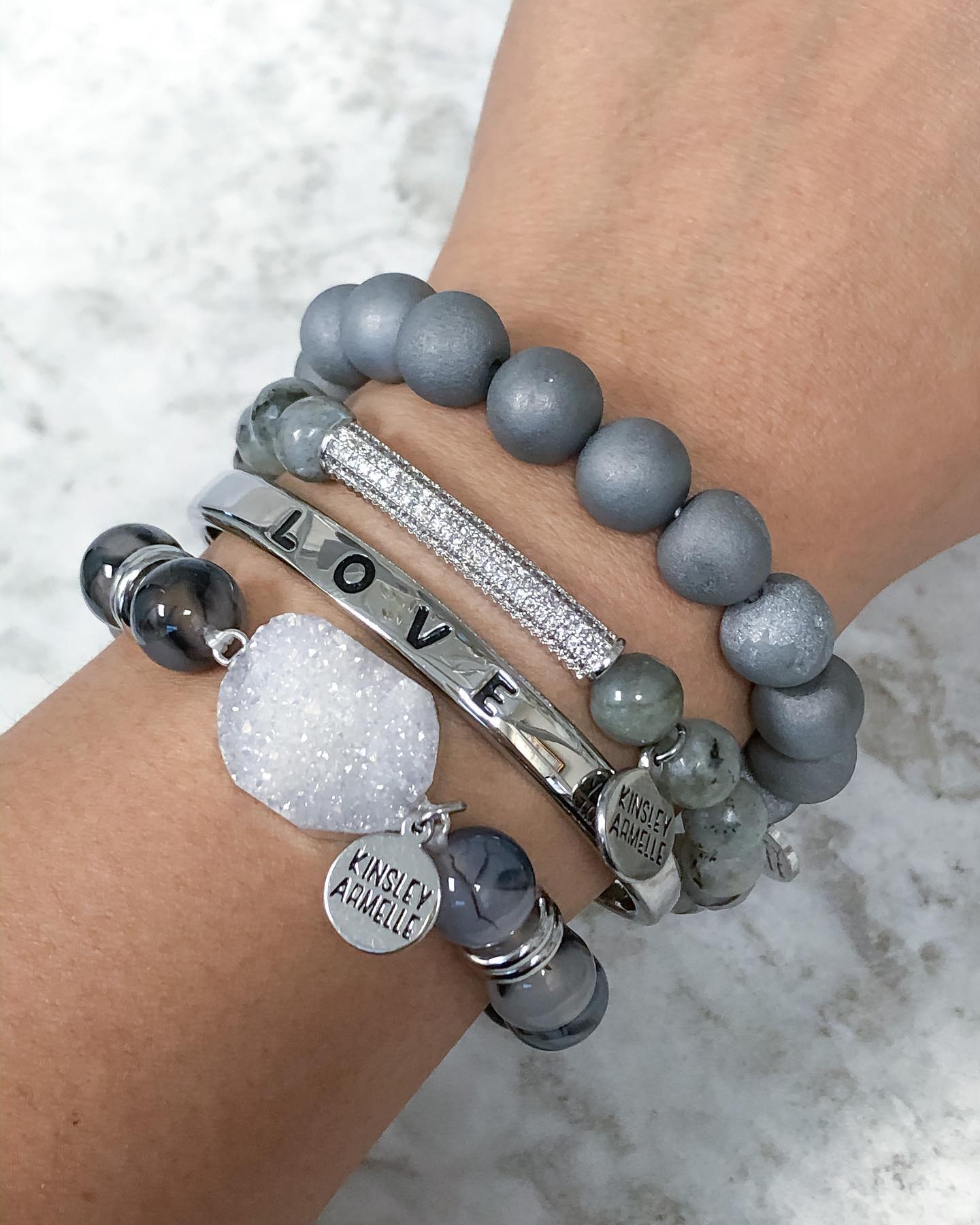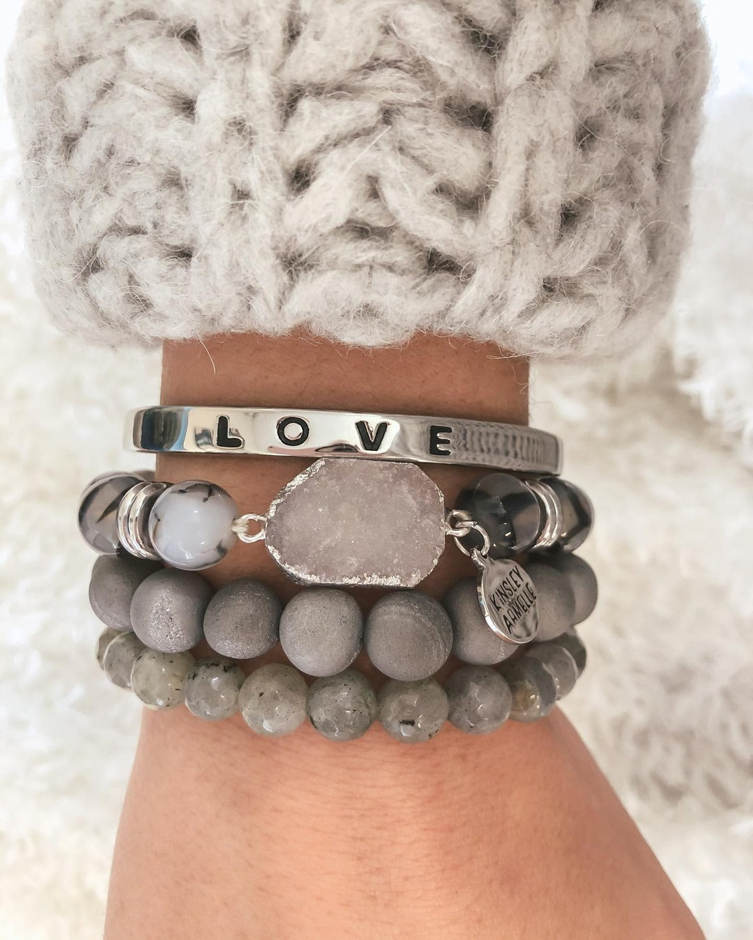 Silver And Gray Cuff Druzy Pave Stackable Hypoallergenic Nickel Free Bracelet Stack Set. Custom Druzy Raw Natural Quartz Stone Accents And Designed With Love In Texas. Size Small, Medium, Large, and Extra Large Ranging From 6.25 - 7.25 Inch Circumference With Custom Sizing Available On Select Pieces.