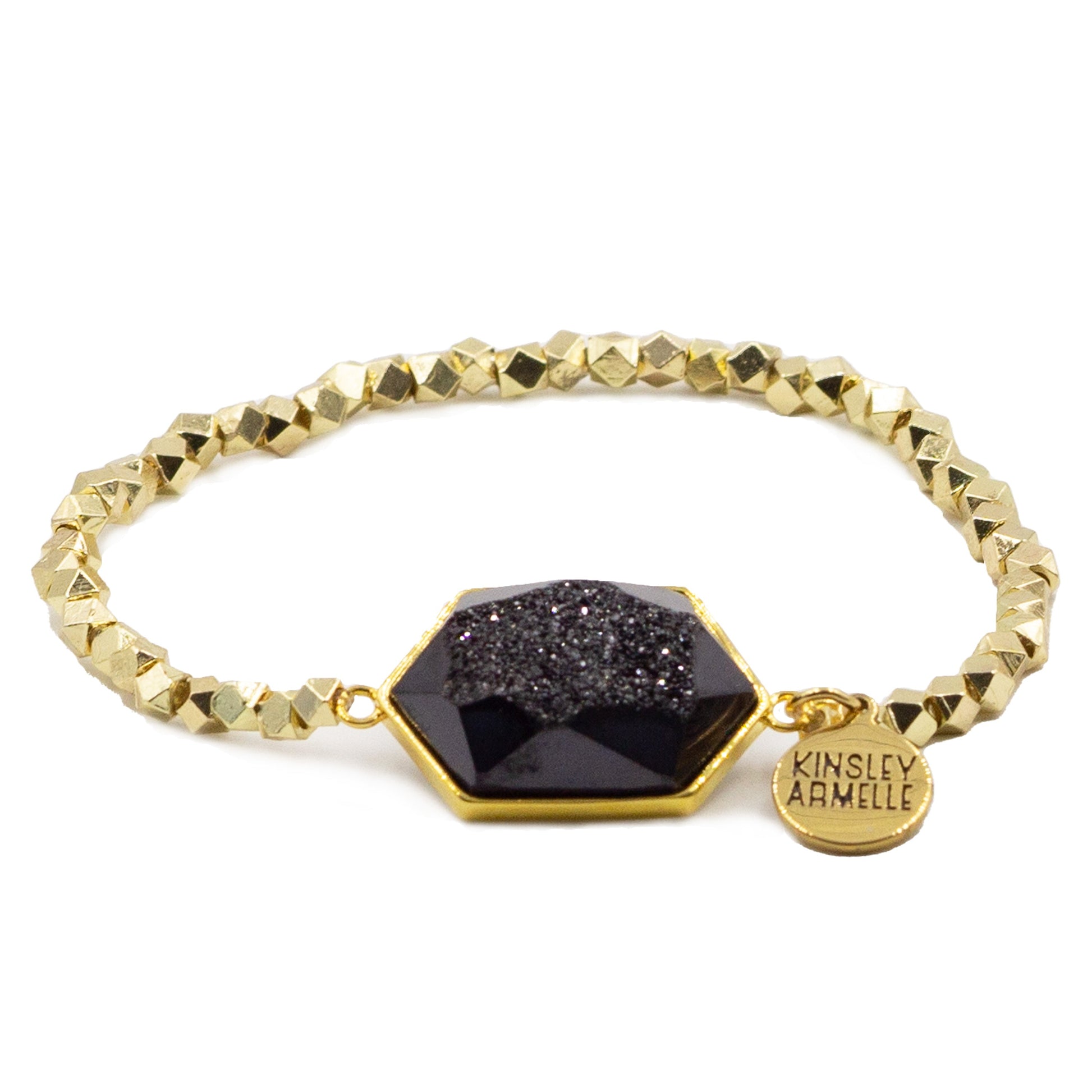 Gold And Black Druzy Geometric Natural Stone Crystal Gemstone Shimmering Sparkling Beaded Stretch Bracelet. Custom Druzy Raw Natural Quartz Stone Accents And Designed With Love In Texas. Size Small, Medium, Large, and Extra Large Ranging From 6.25 - 7.25 Inch Circumference With Custom Sizing Available On Select Pieces.
