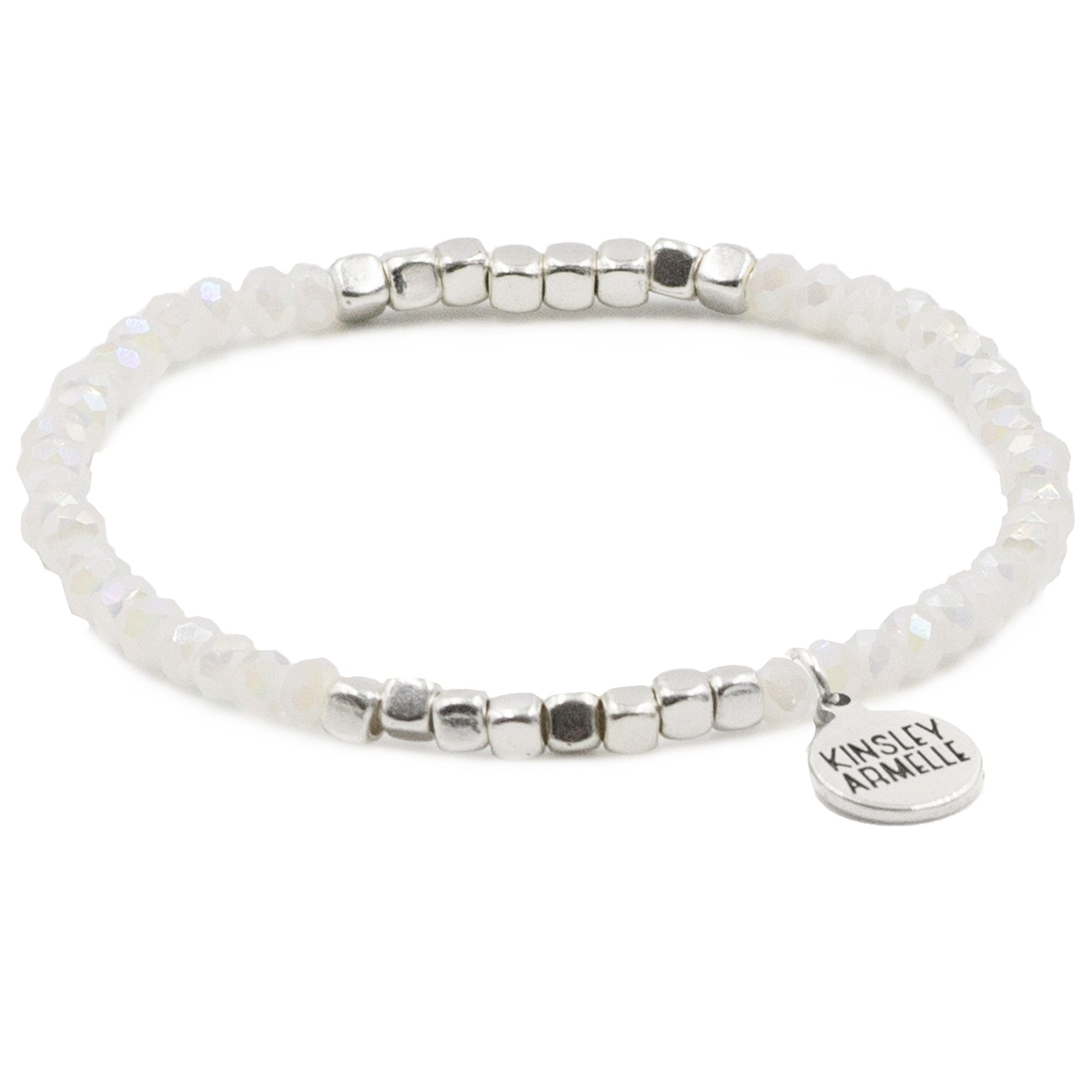 Silver And White Faceted Iridescent Marble Shimmering Sparkling Beaded Stretch Bracelet. Custom Silver Plated Brass Decorative Accent Beads Accents And Designed With Love In Texas. Size Small, Medium, Large, and Extra Large Ranging From 6.25 - 7.25 Inch Circumference With Custom Sizing Available On Select Pieces.