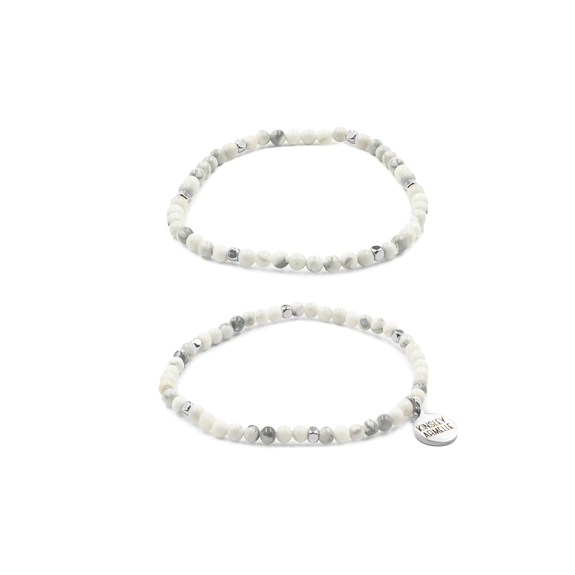 Silver And White Marble Multistrand Stackable Thin Hypoallergenic Nickel Free Bracelet Stack Set. Custom Silver Ion Plated Stainless Steel Charm Accents And Designed With Love In Texas. Size Small, Medium, Large, and Extra Large Ranging From 6.25 - 7.25 Inch Circumference With Custom Sizing Available On Select Pieces.