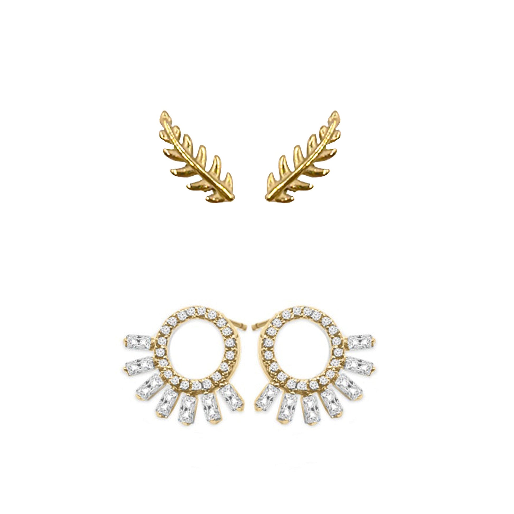 Gold And White Dainty Diamond Geometric Leaf Feather Pave Featherweight Hypoallergenic Nickel Free Dainty Earring Stack Set. Custom Zircon Gemstones Raw Natural Stone Accents And Designed With Love In Texas. Size Finley Collection - Pearl Earrings: 0.5 Inch Wide x 0.5 Inch Length | Goddess Collection - Petite Laurel Leaf Stud Earrings: 10mm Length x 3mm Width With Custom Sizing Available On Select Pieces.