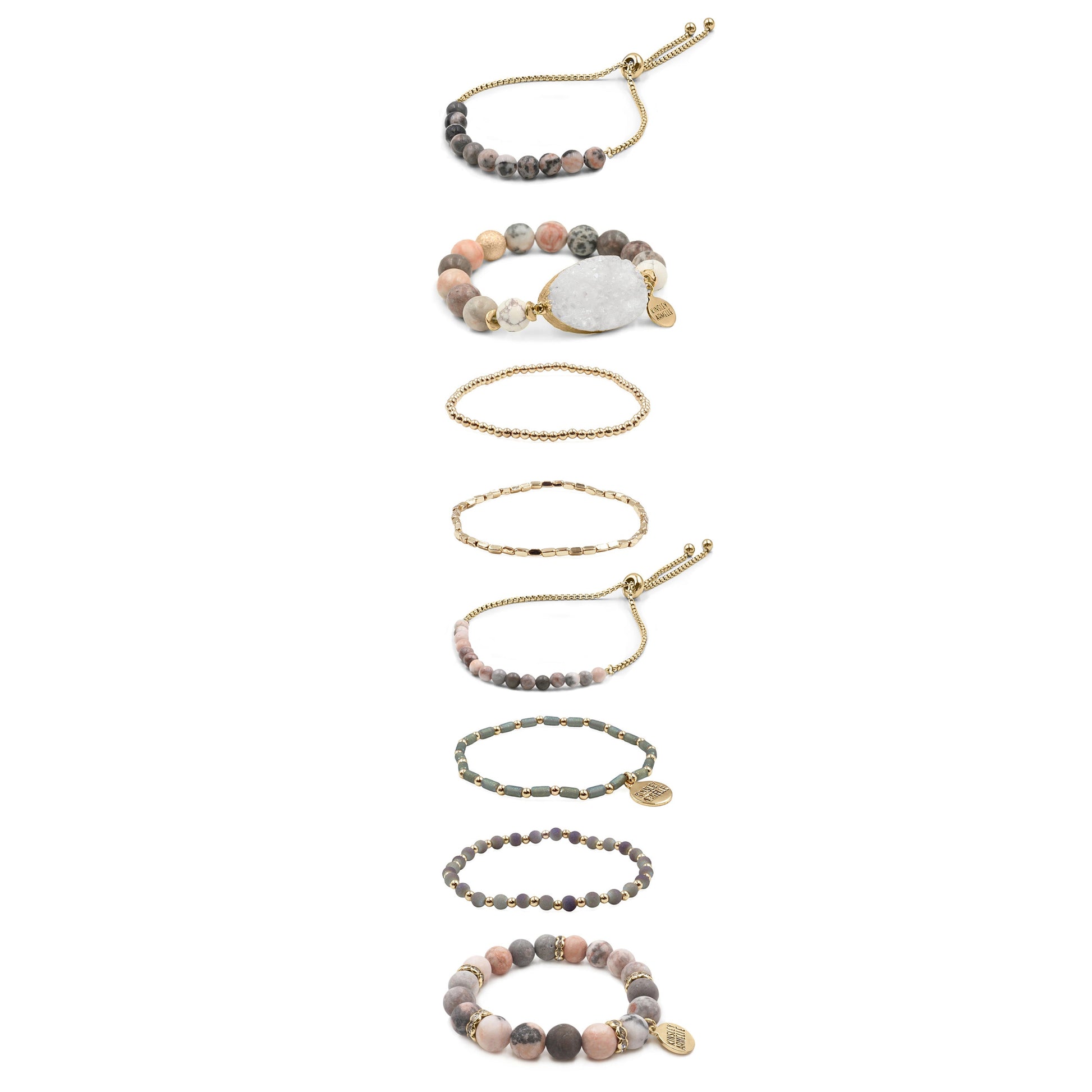 Gold And Pink Beads Druzy Natural Stone Crystal Gemstone Raw Stackable Wrap Hypoallergenic Nickel Free Bracelet Stack Set. Custom Druzy Raw Natural Quartz Stone Accents And Designed With Love In Texas. Size Small, Medium, Large, and Extra Large Ranging From 6.25 - 7.25 Inch Circumference With Custom Sizing Available On Select Pieces.