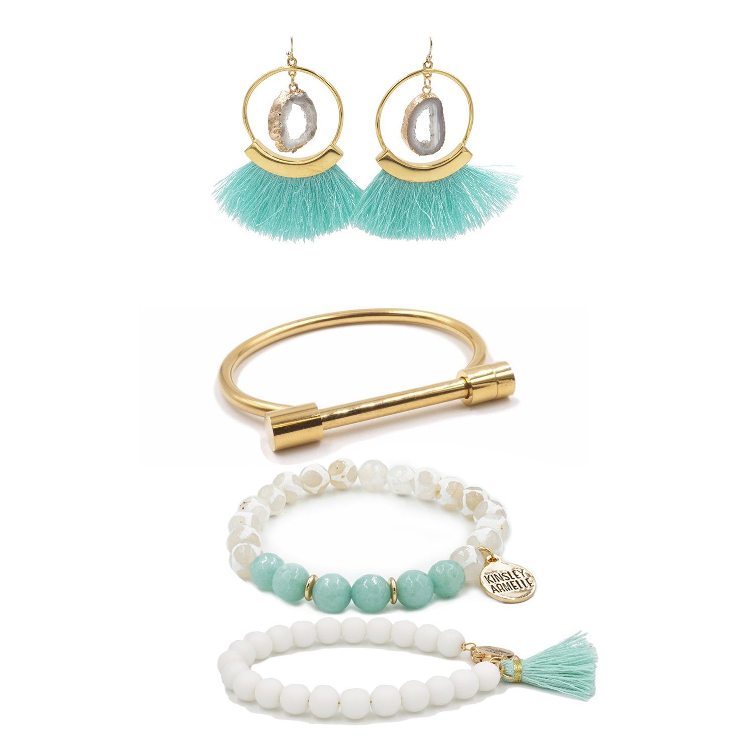 Gold And Light Blue Beads Drop Earrings Fringe Jewelry Set Multicolored Screw Tassel Hypoallergenic Nickel Free Jewelry & Bracelet Stack Set. Custom Agate Slices Raw Natural Stone Accents And Designed With Love In Texas. Size Small, Medium, Large, and Extra Large Ranging From Bracelets: 6.25 - 7.25 Inch Circumference | Earrings: 3.5 Inches Length x 1.5 Inches Width With Custom Sizing Available On Select Pieces.