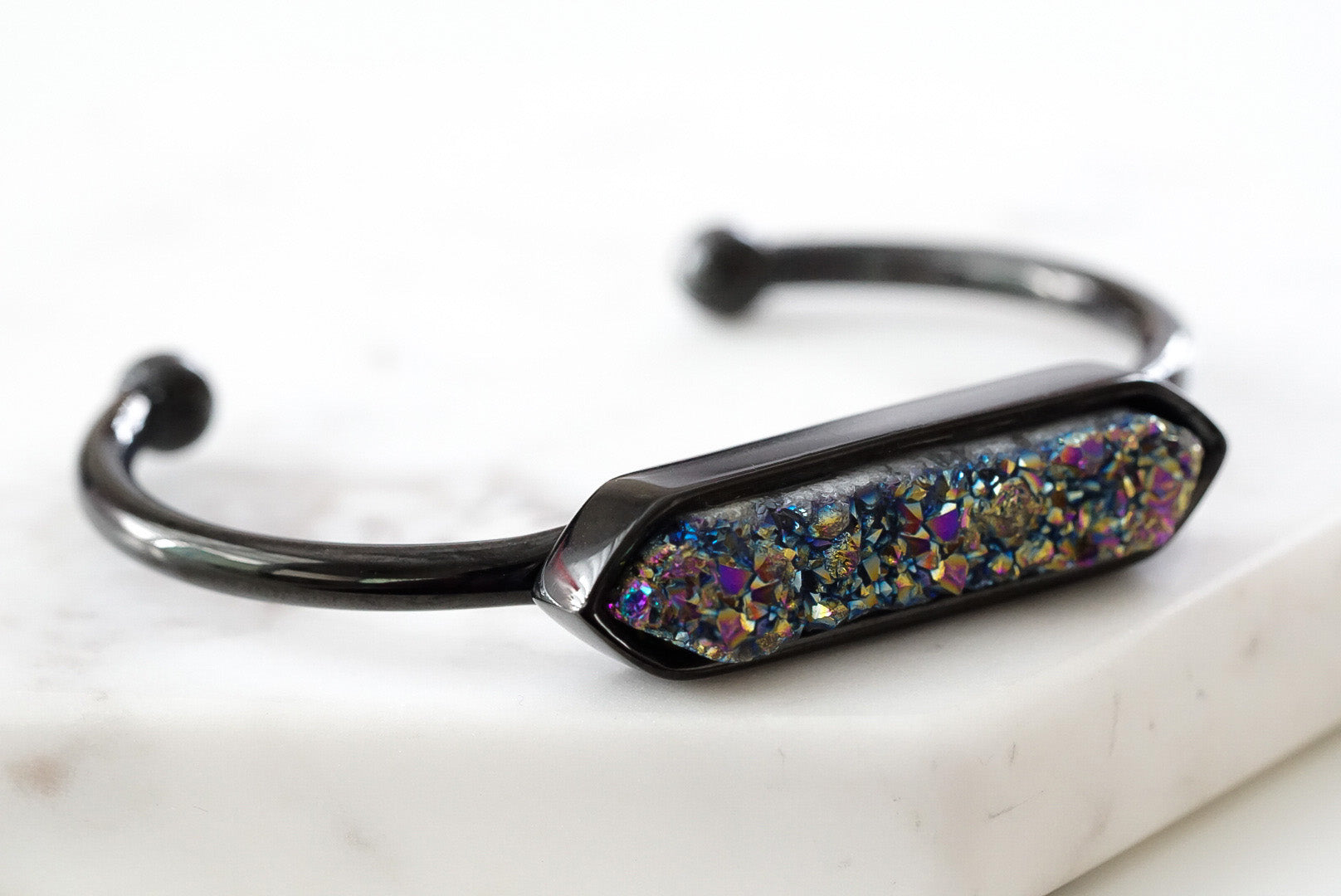 Black And Blue Hypoallergenic Nickel Free Bangle Cuff Bracelet. Custom Druzy Raw Natural Quartz Stone Accents And Designed With Love In Texas. Size Small, Medium, Large, and Extra Large Ranging From 6.25 - 7.25 Inch Circumference With Custom Sizing Available On Select Pieces.