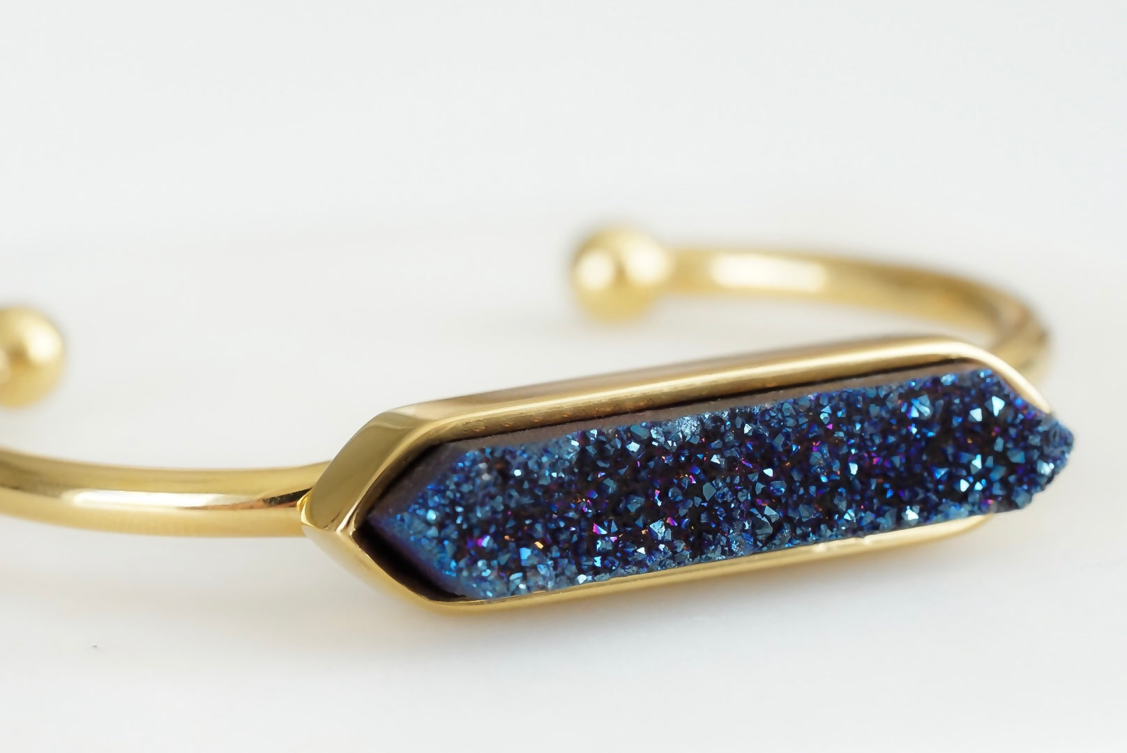 Gold And Blue Hypoallergenic Nickel Free Bangle Cuff Bracelet. Custom Druzy Raw Natural Quartz Stone Accents And Designed With Love In Texas. Size Small, Medium, Large, and Extra Large Ranging From 6.25 - 7.25 Inch Circumference With Custom Sizing Available On Select Pieces.