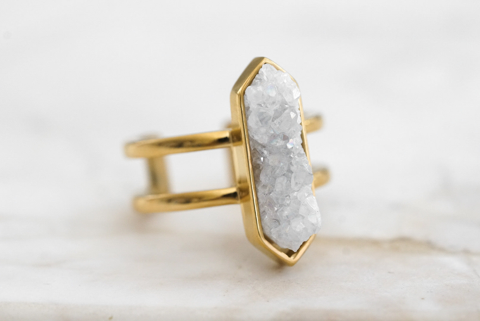 Gold And White Hypoallergenic Nickel Free Cuff Ring. Custom Druzy Raw Natural Quartz Stone Accents And Designed With Love In Texas. Size 6 With Custom Sizing Available On Select Pieces.